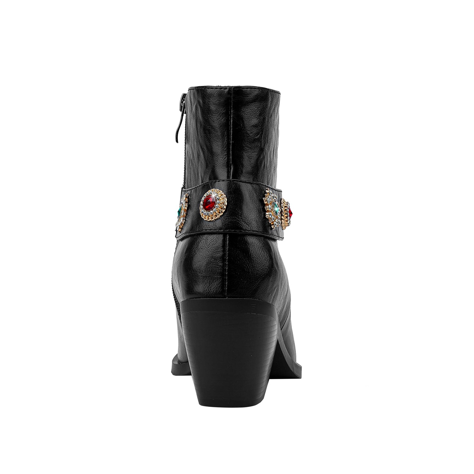 Saddle up in sparkle with the Autumn Crystal Embellished Strap Western Black Ankle Boots, where cowgirl grit meets glam refinement in every step. These boots will dazzle under golden sunsets and neon rodeo lights alike.