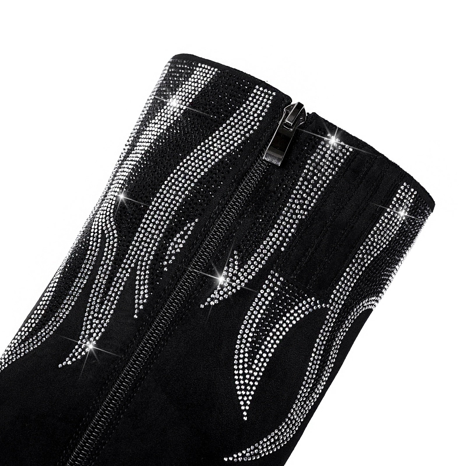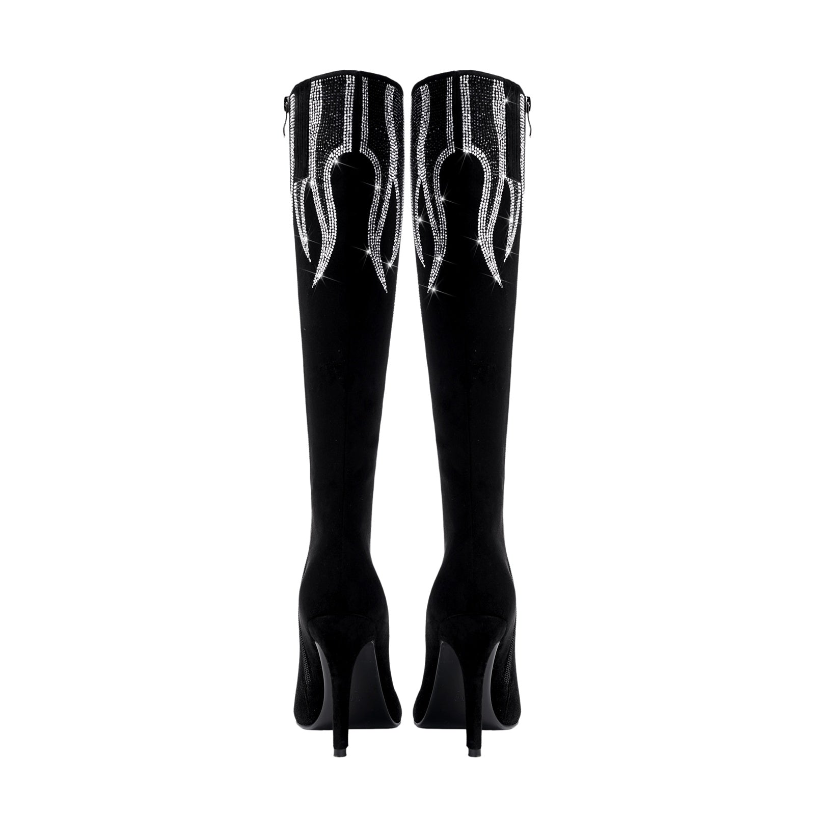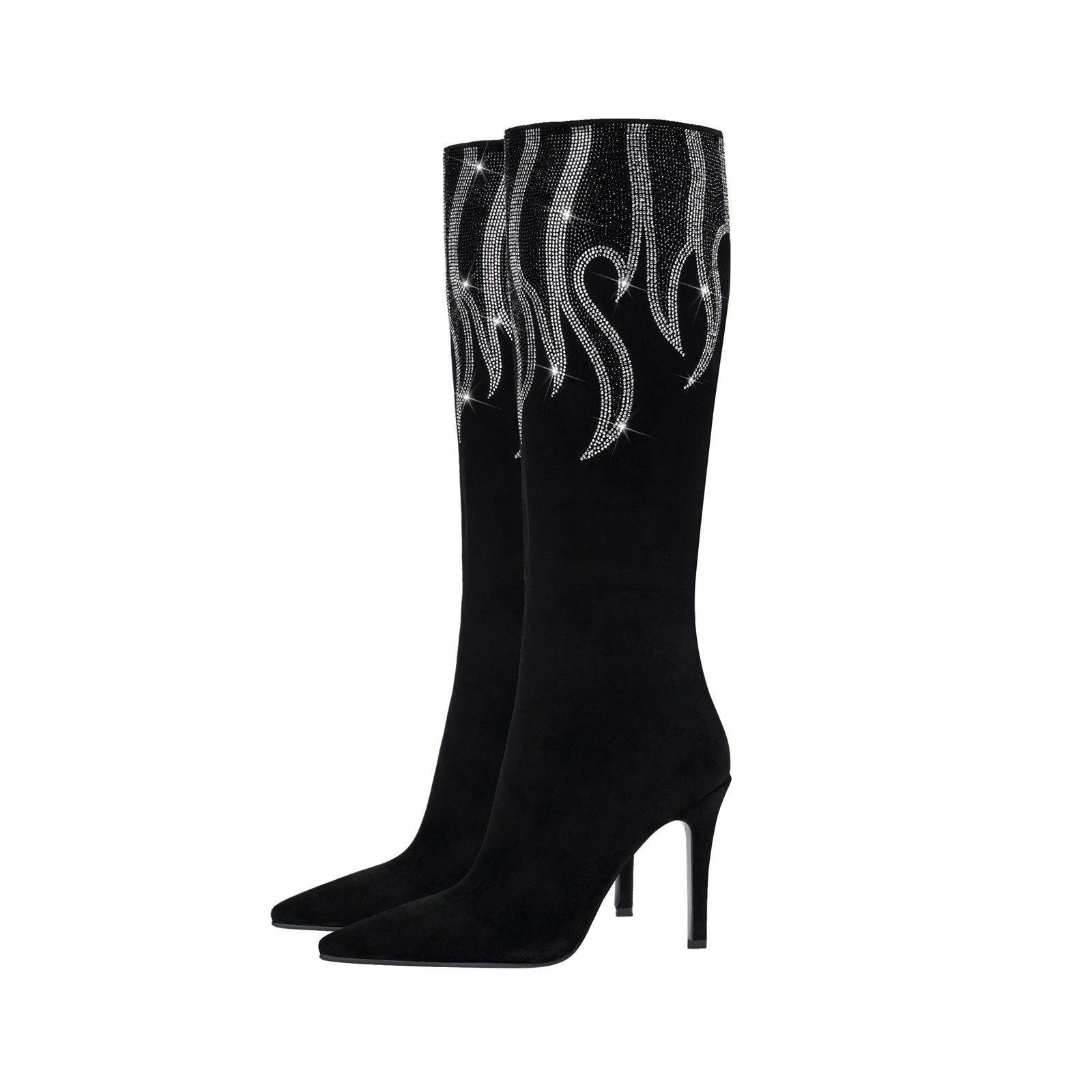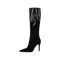 Light up every room in the Black and Silver Flame Pointed Toe Knee High Boots, a bold, fiery statement made for the girl who walks with heat. With their sleek stiletto heel, striking pointed toe, and rhinestone flame detailing, these boots are pure power wrapped in sparkle and suede.