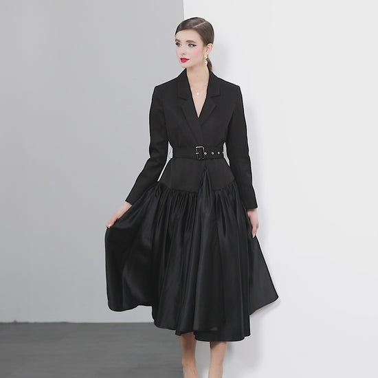 Where boardroom confidence meets ballroom grace, the Black Belted Blazer Flared Midi Dress redefines power dressing with a couture twist. This commanding silhouette fuses tailored structure with dramatic movement, creating a show-stopping look for the woman who leads with elegance.