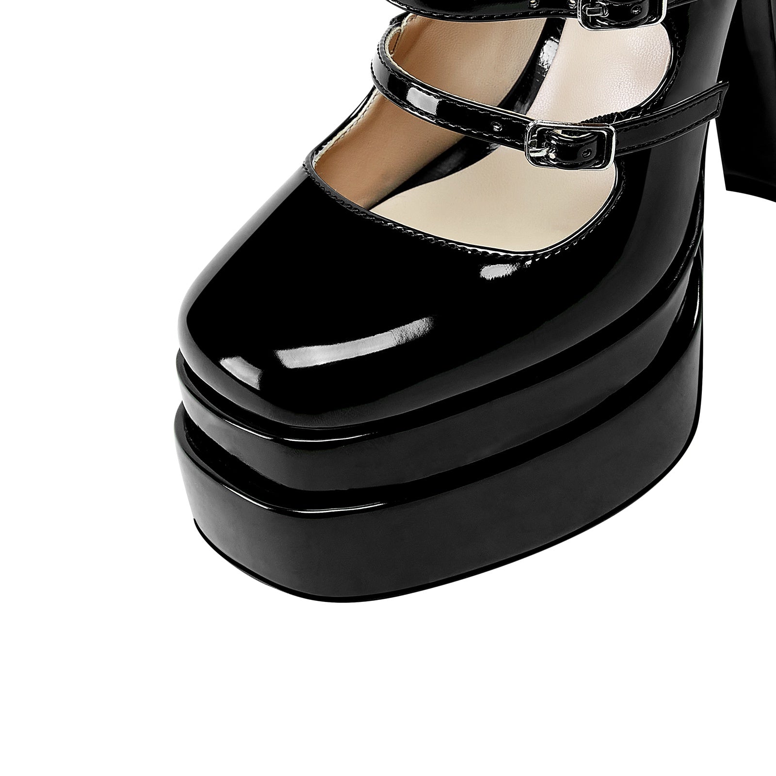 Bring back the drama with unapologetic height and hypnotic shine in the Black Strappy Mary Jane Platform Heels. These ultra-elevated beauties reimagine the classic Mary Jane with seductive strappy details and a glossy patent finish - made for dancing under lights and turning sidewalks into catwalks.