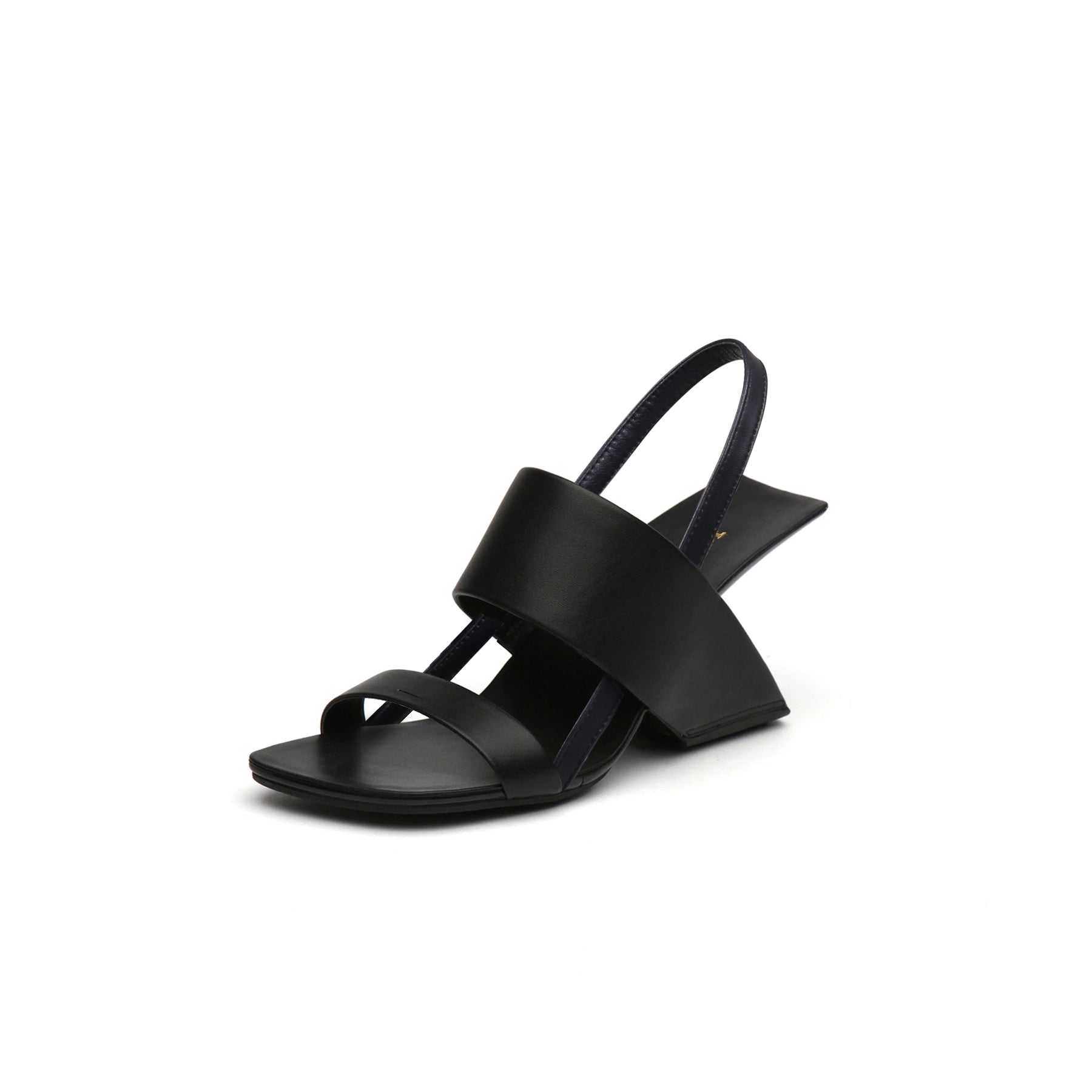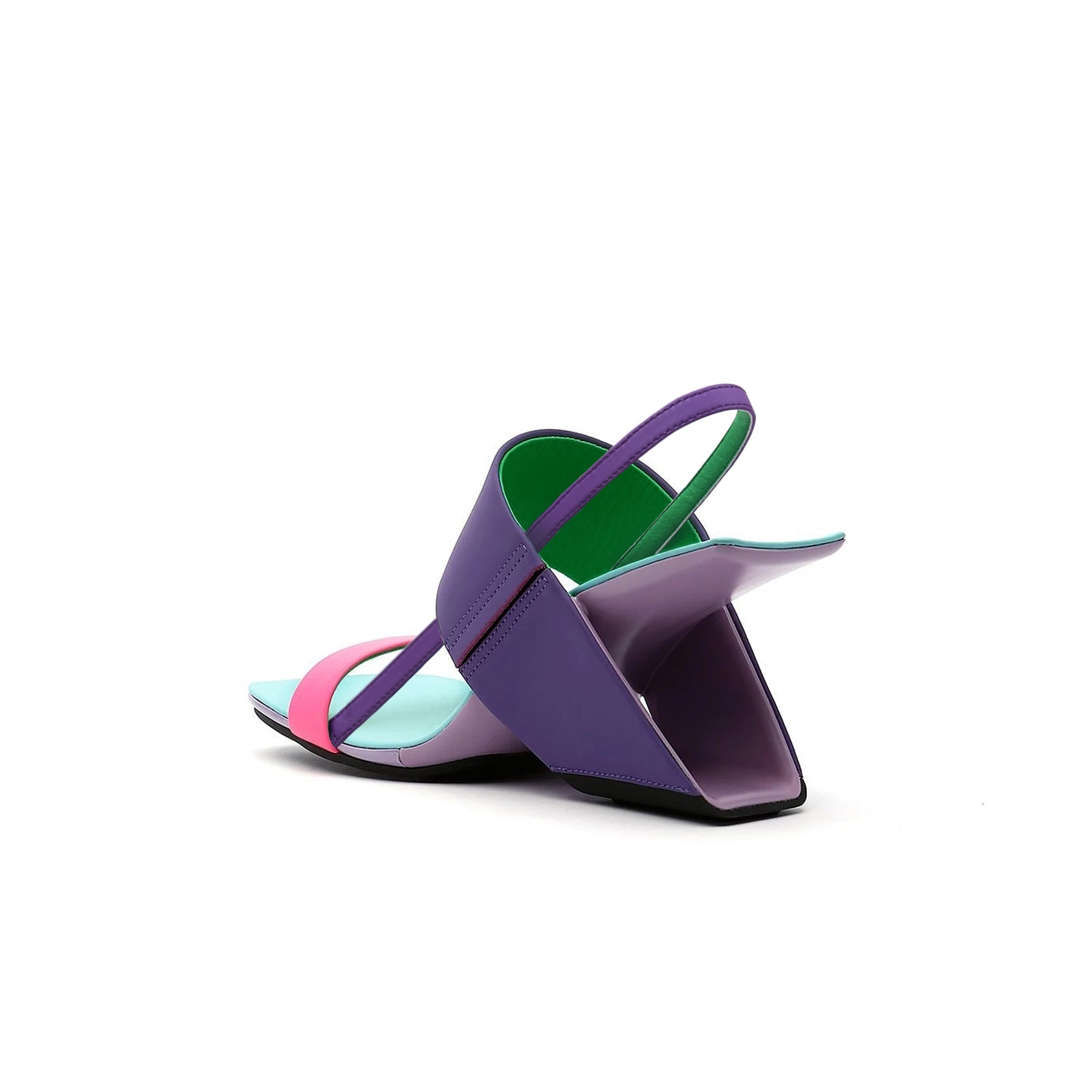 - The sharply angled heel creates visual drama while offering geometric elegance