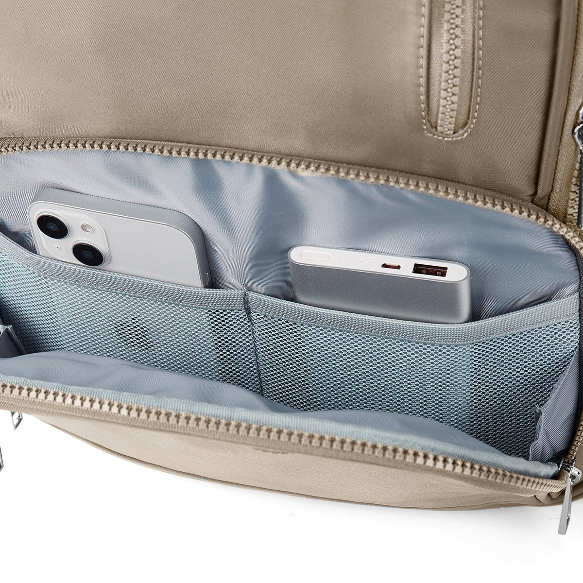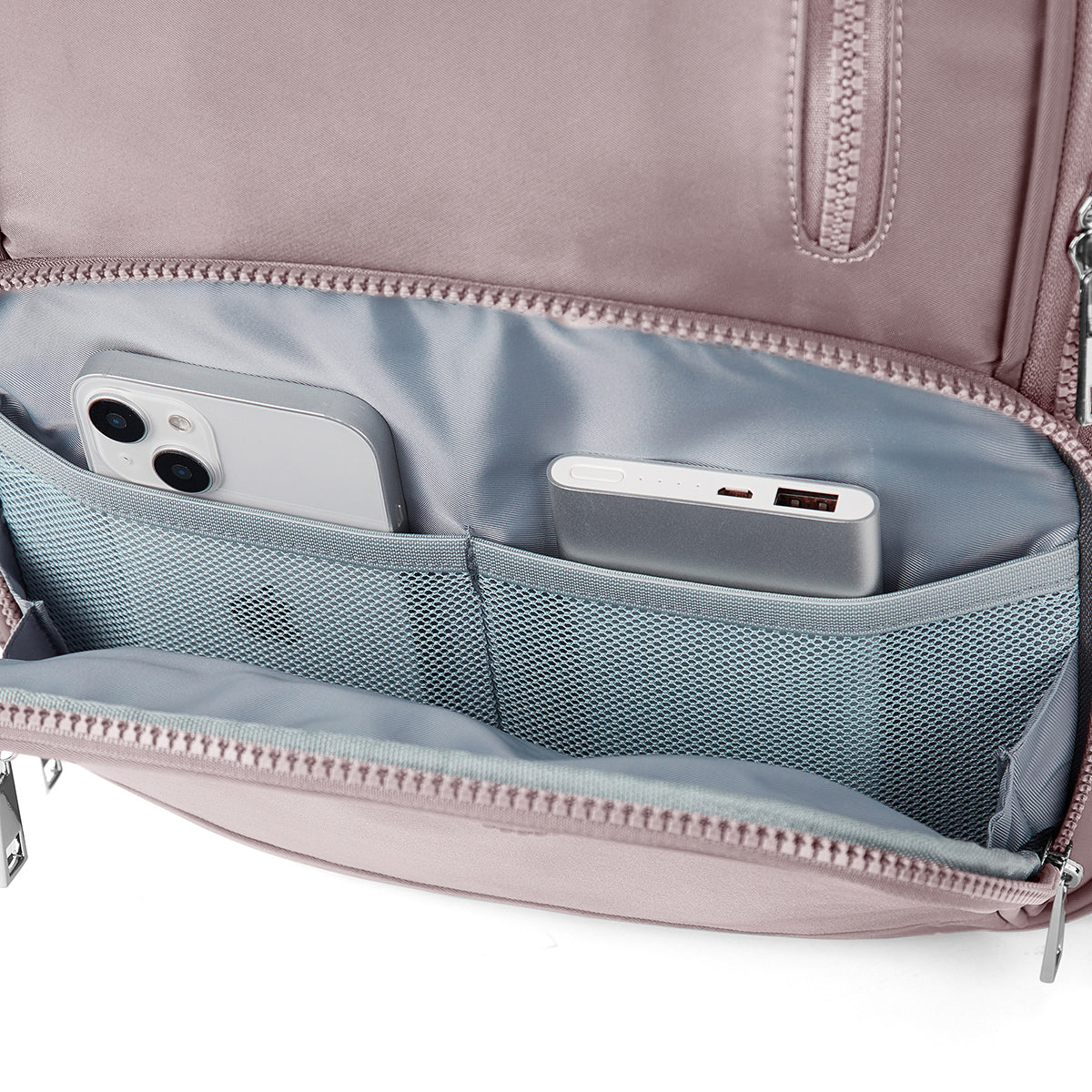 - Three front zipper pockets for quick-access items like chargers, pens, or travel snacks