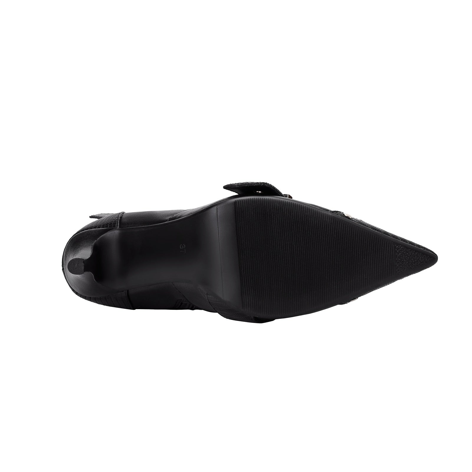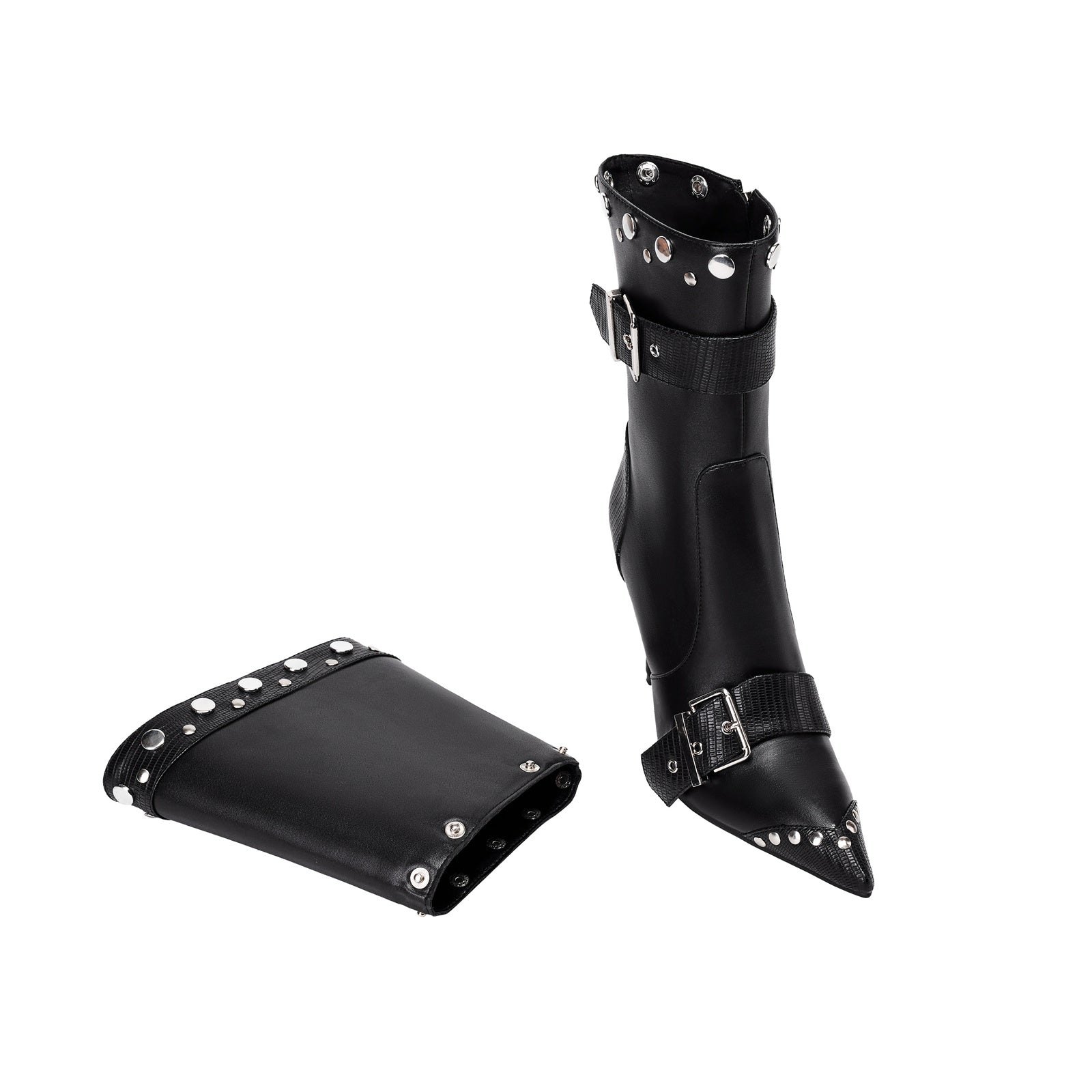 Unleash your inner vixen with the Convertible Double Buckle Black Pointed Toe Boots, a dangerously seductive stiletto that dares to dominate. Wrapped in sleek black faux leather and finished with silver studs and a bold buckle. With the detachable foldover, you can enjoy wearing these boots in two different ways: wear them on their own as your regular ankle boots or go full glam and attach the foldover wrap to transform them into ankle boots.