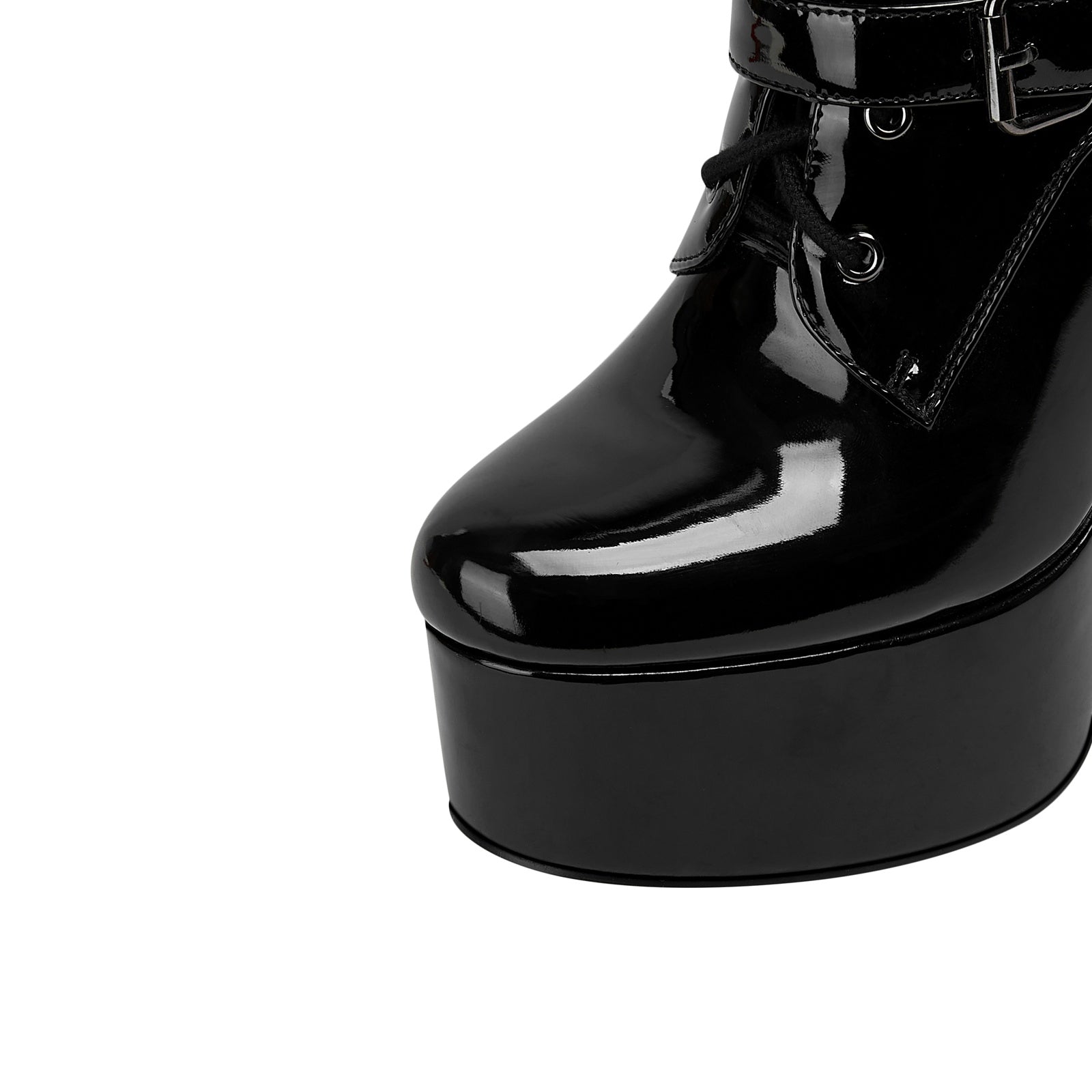 - The glossy patent leather finish amplifies shine and attitude for bold, high-shine drama