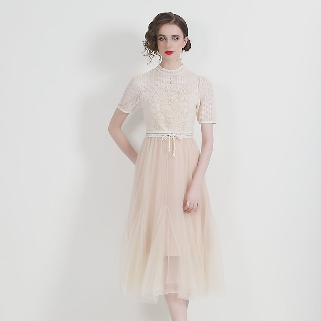 - The voluminous mesh skirt flows into a graceful midi length, giving the piece a sense of airiness and refined drama
