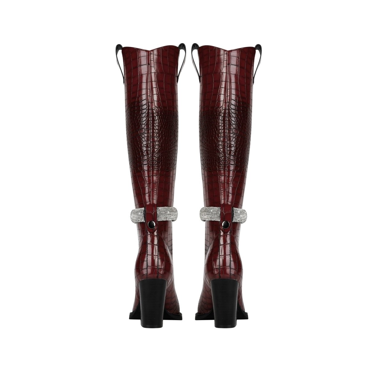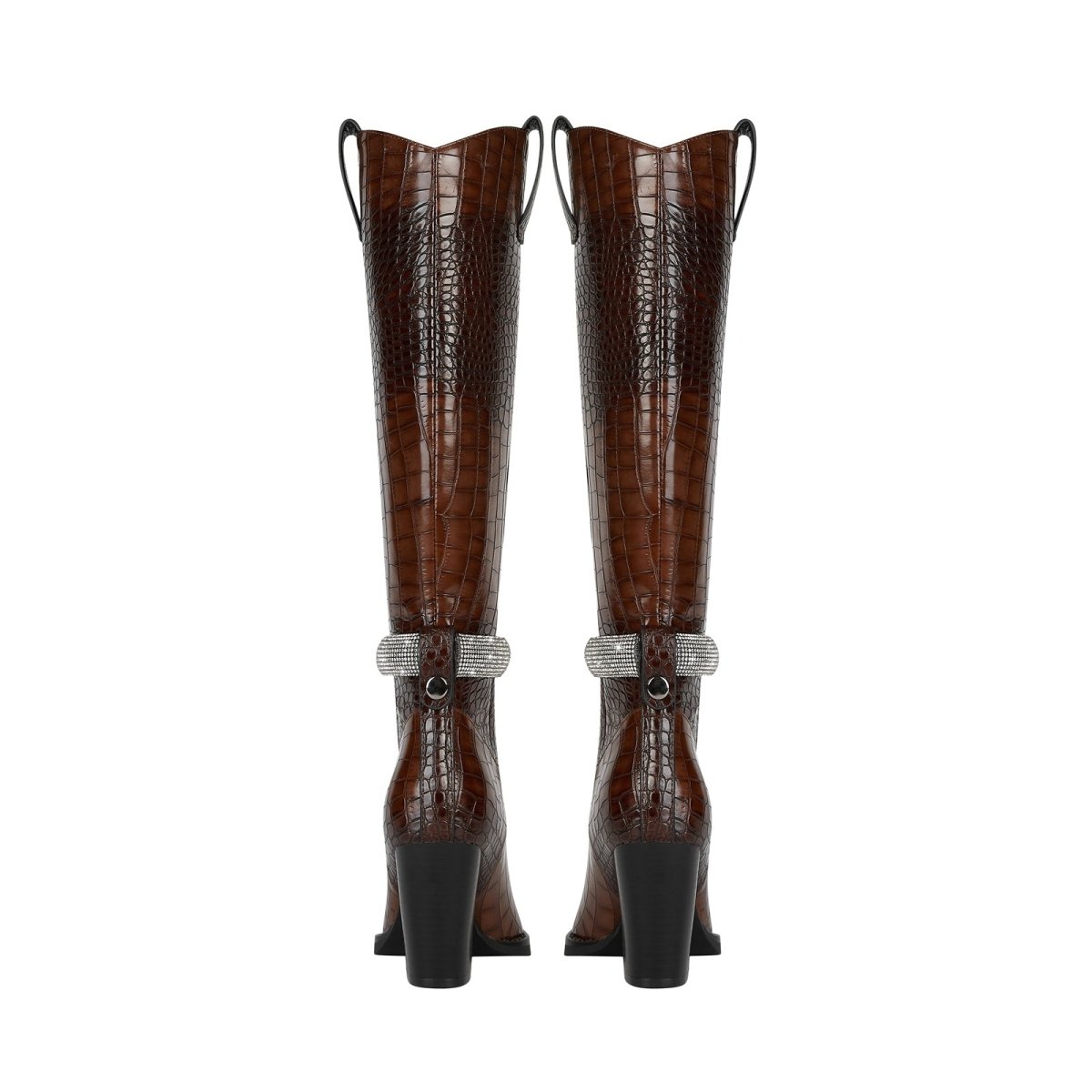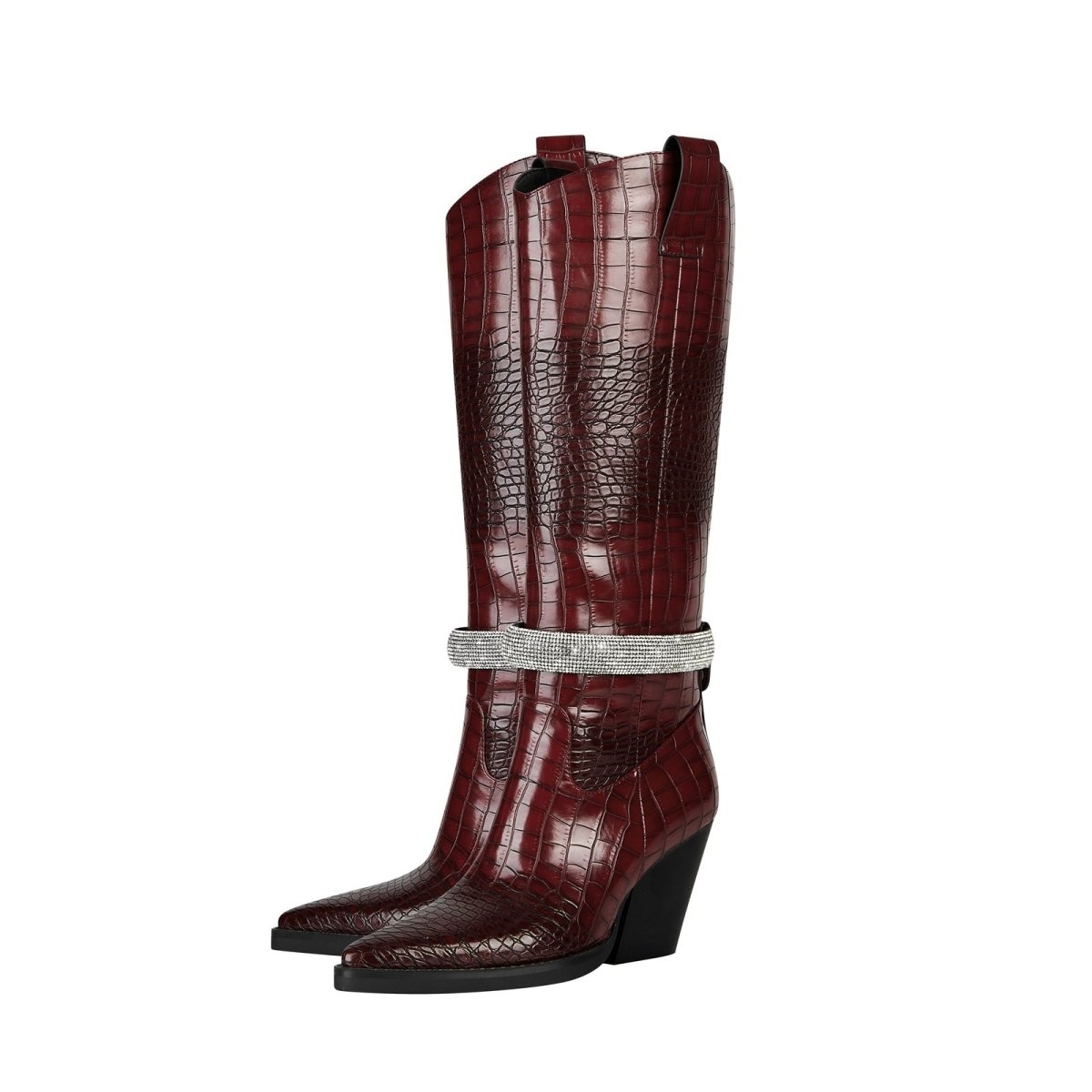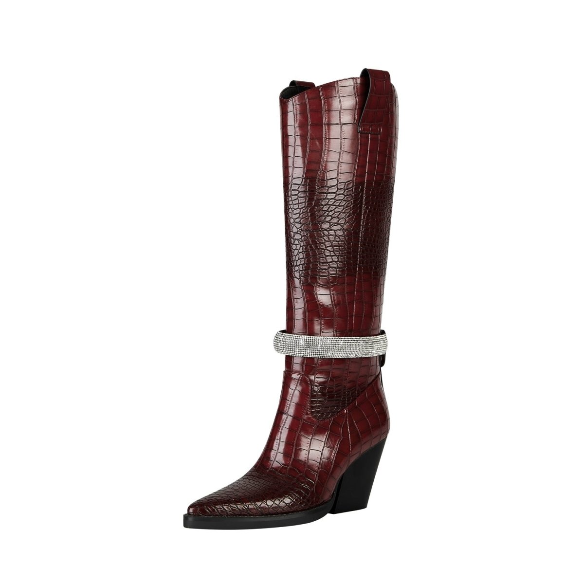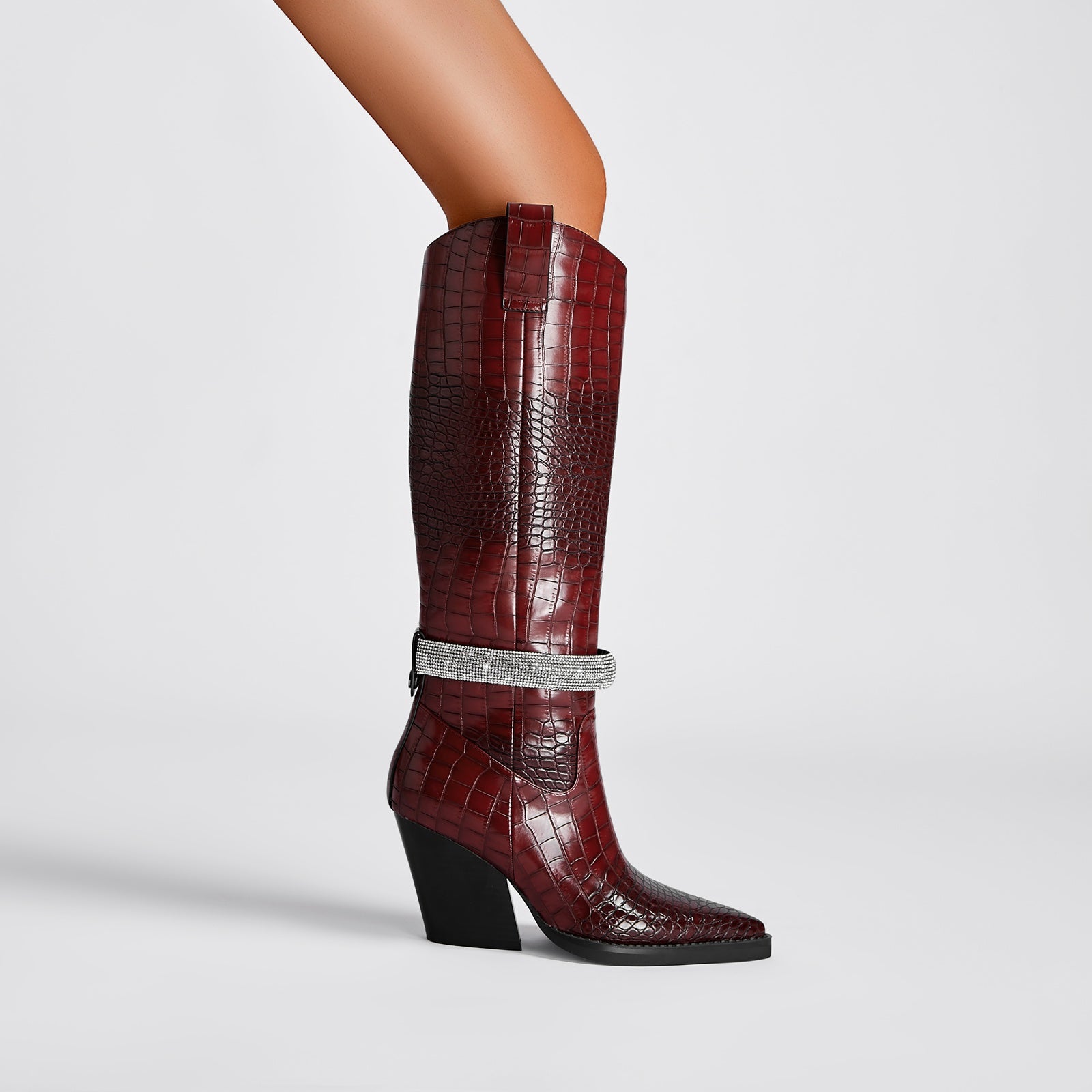 Sleek sophistication gets a modern glow-up in the Diamond Encrusted Band Leather Knee High Boots, where timeless structure meets fresh sparkle. Crafted in glossy croc-embossed leather and finished with a crystal-studded wrap, this elevated essential adds just the right touch of drama to your fall wardrobe.