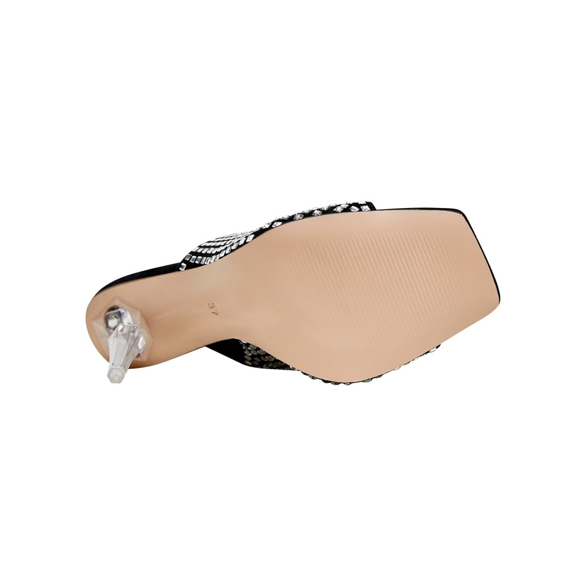 - The clear sculptural heel creates visual intrigue and modern contrast to the glitzy upper