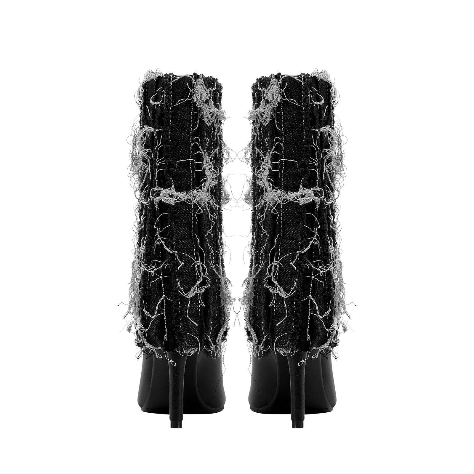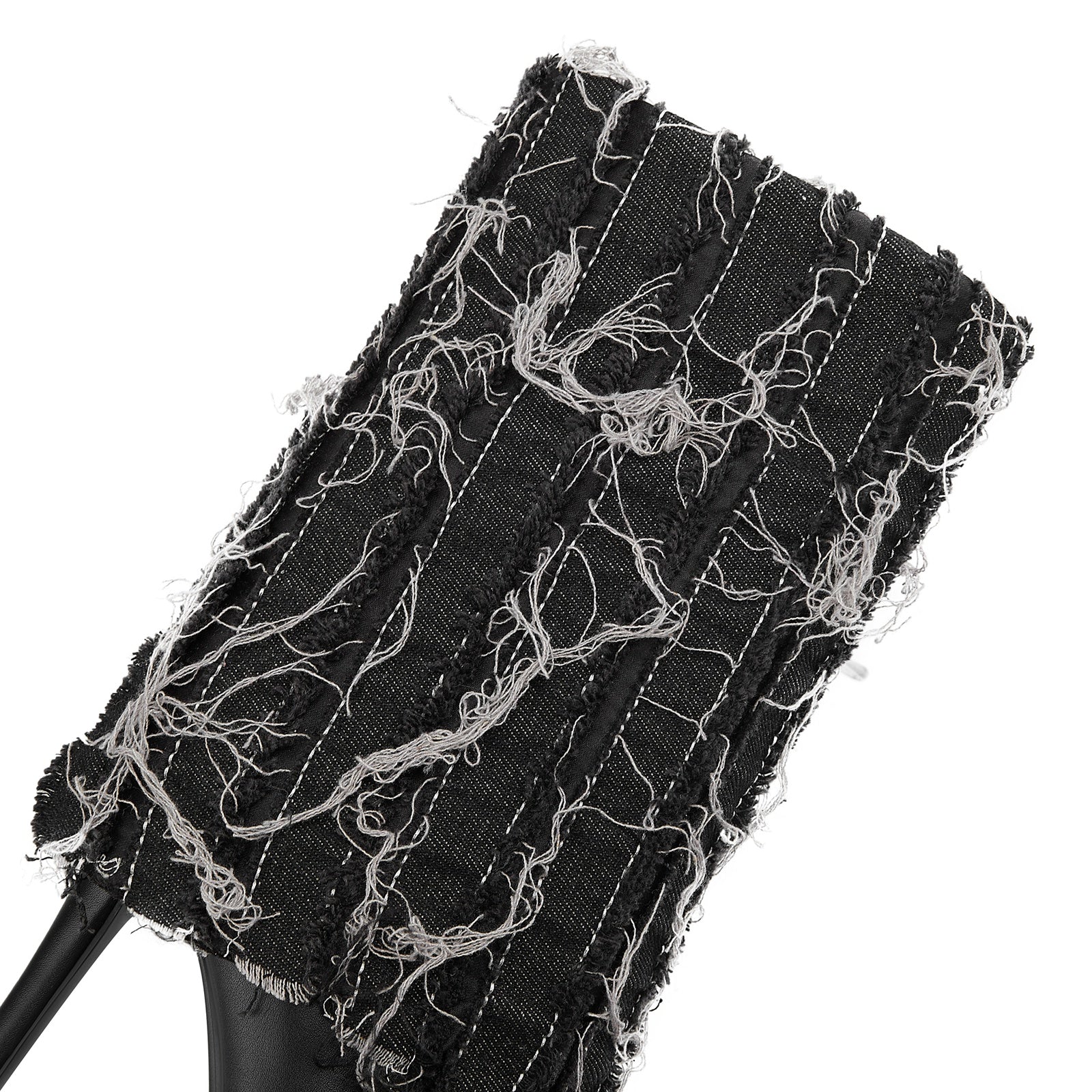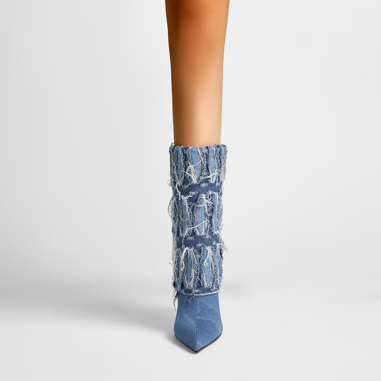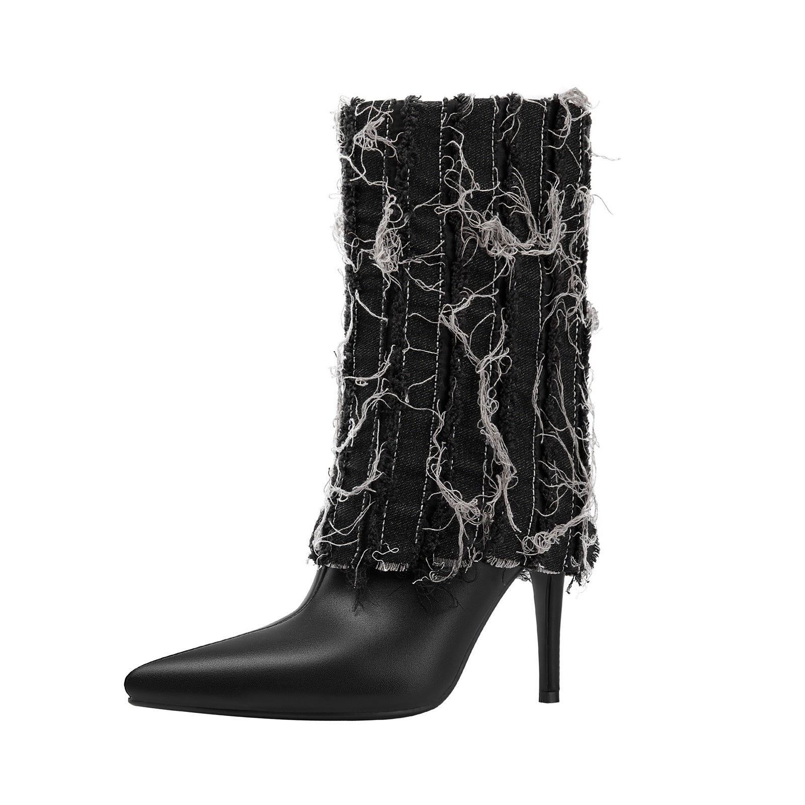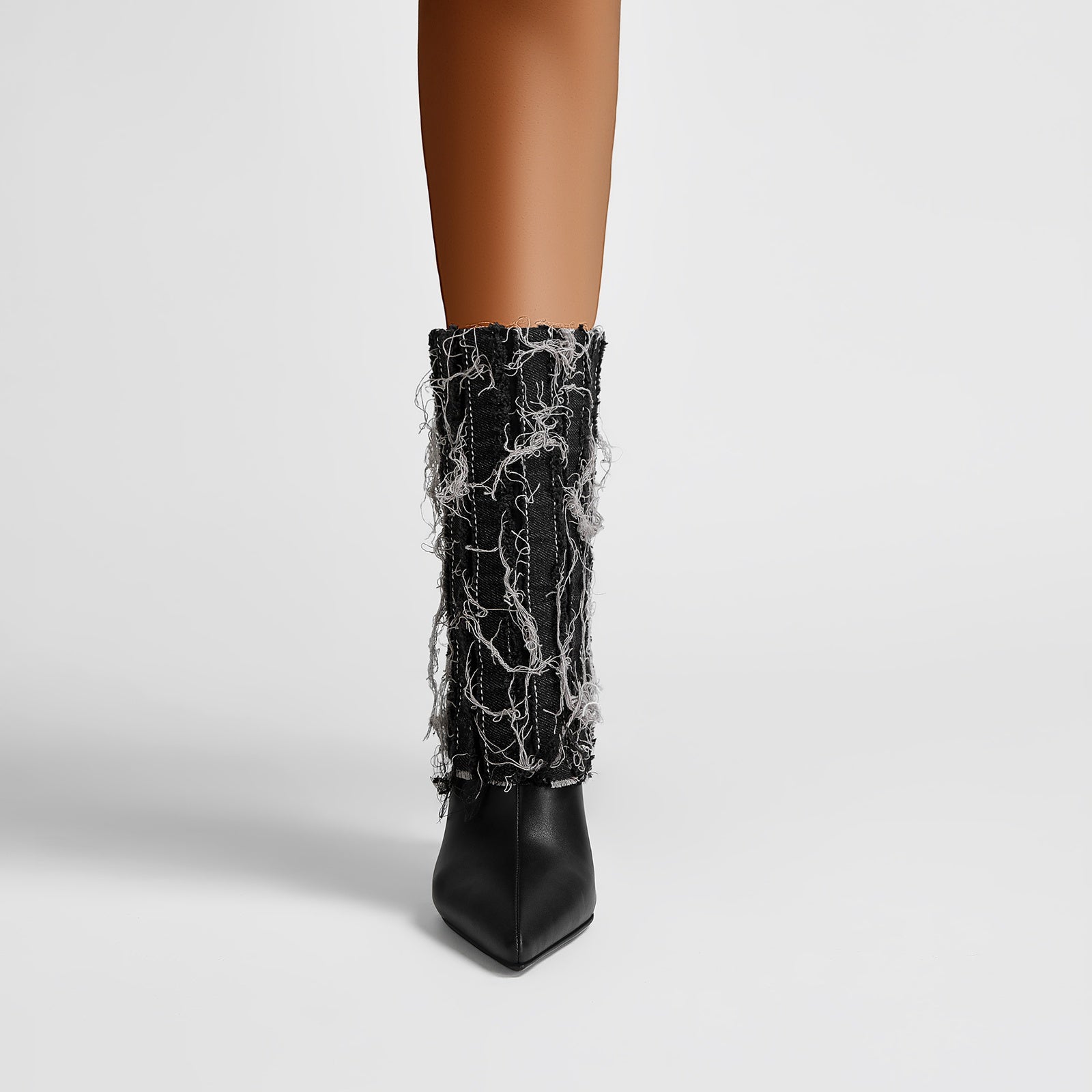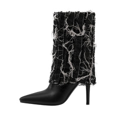 Grunge glam gets a high-fashion twist in the Distressed Denim Fold Over Leather Mid Calf Boots - a head-turning hybrid of streetwear cool and runway drama. Wrapped in heavily frayed denim with a sculpted stiletto heel and sleek pointed toe, this statement boot delivers texture, attitude, and unapologetic confidence in every step.