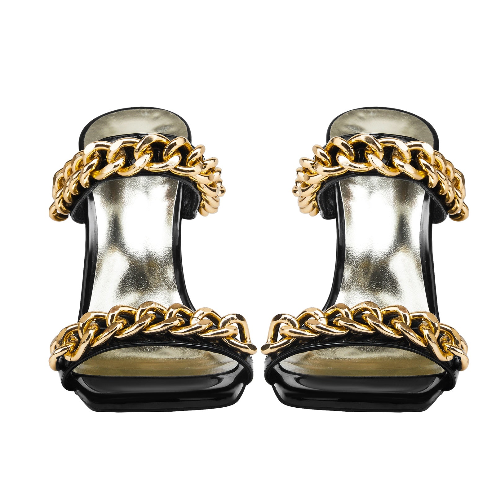 - The double gold chain straps give luxe texture and bold visual impact while holding the foot securely