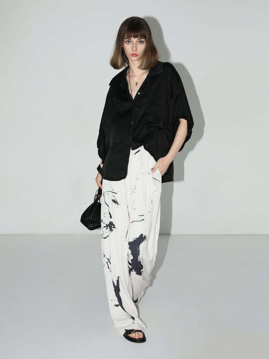 This exquisite Draped Satin Batwing Shirt with Drawstring is the ultimate fusion of relaxed luxury and modern chic. The textured satin fabric adds depth and dimension, while the drop-shoulder silhouette and batwing sleeves create a draped, flowing effect.