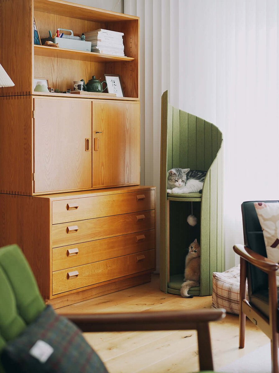 This time tower is a structure that allows cat to just play and forget about the flow of time. Adorned with flowing lines and a spiral open space on the upper level, this tower of time tree captures the changing light and shadows, evoking a sense of time gently passing by.