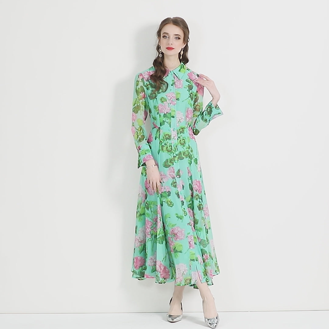 Floral Green Flared Waist Cinching LongSleeve Shirt Dress 819