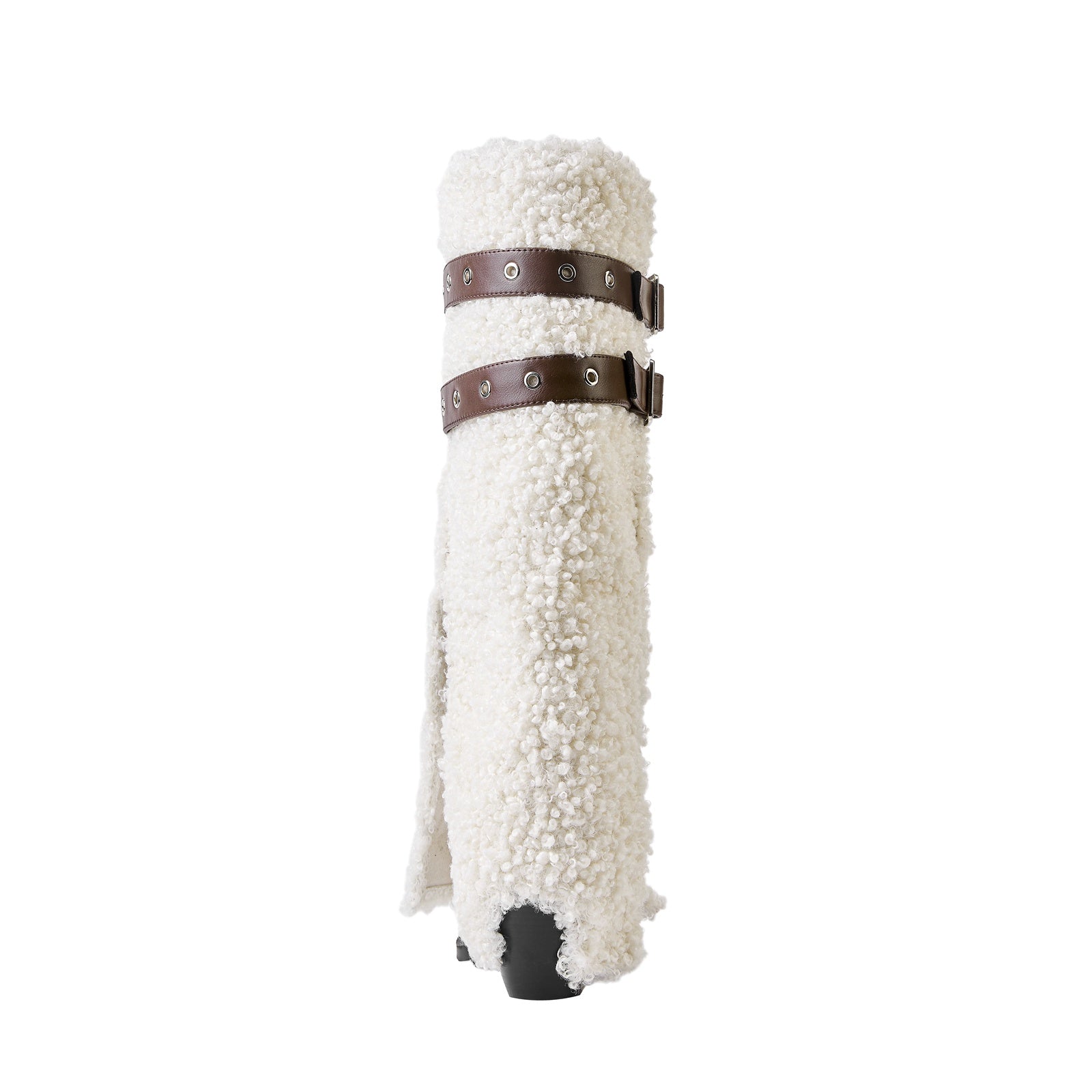 Fluffy White Panel Knee High Boots with Leather Buckles