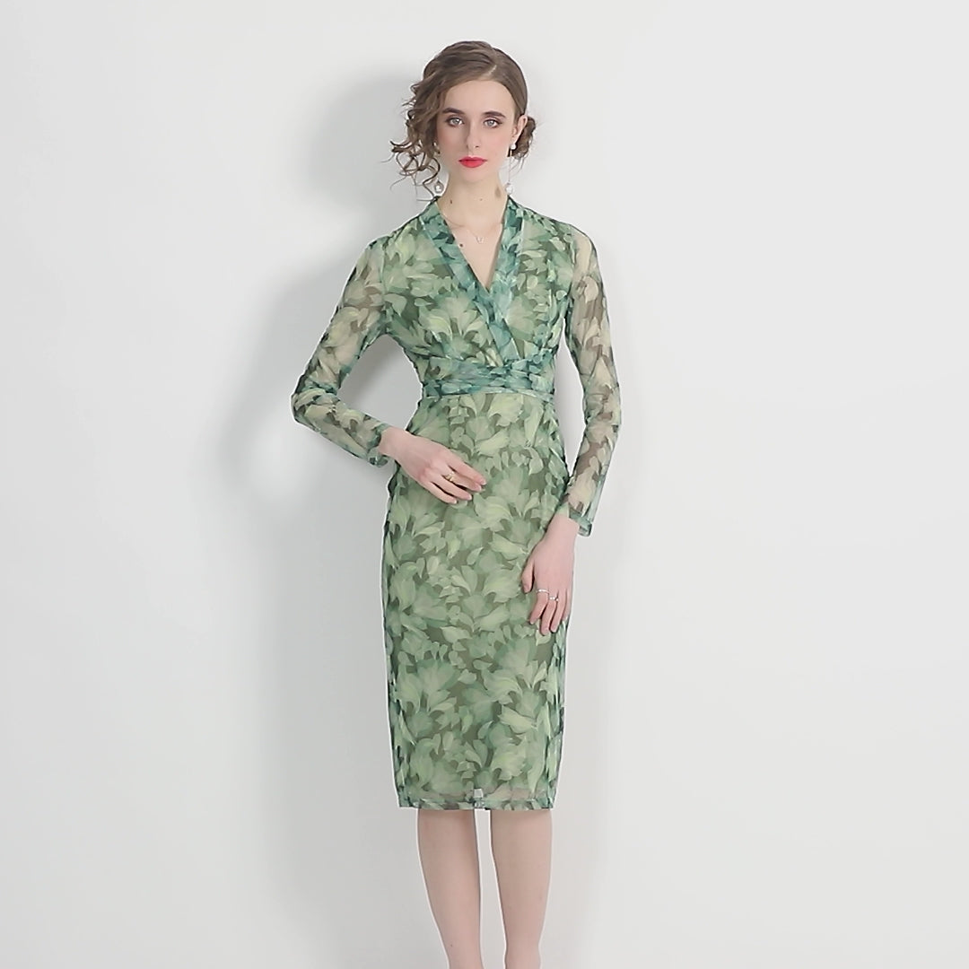 A vision of understated glamour, the Form Fitting V Neck Mesh Floral Green Tea Dress is a modern classic designed to flatter and enchant. With its soft, botanical tones and sculpted silhouette, this piece captures the effortless grace of garden soirées and cocktail evenings alike. It’s the kind of dress that whispers elegance with every movement.