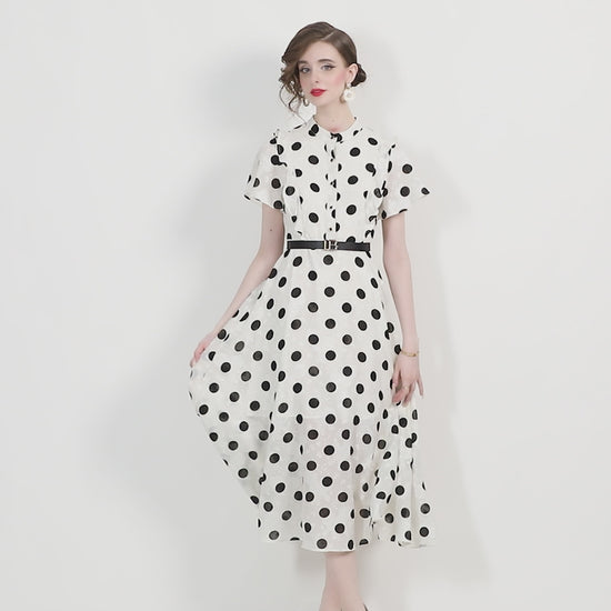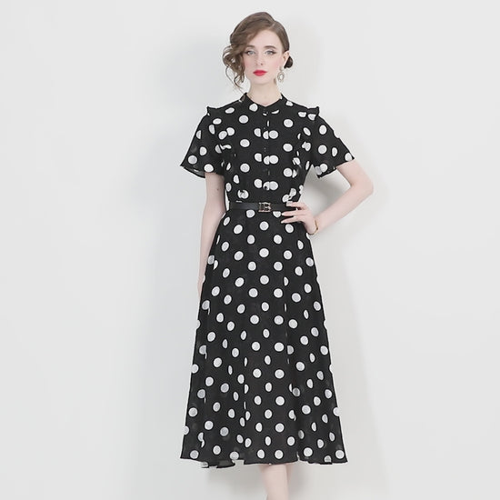 French Polka Dot Print Stand Collar Midi A Line Dress