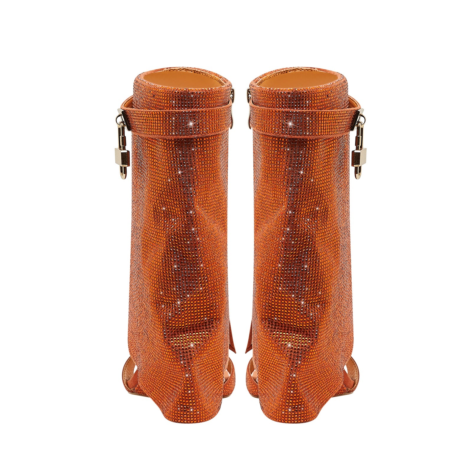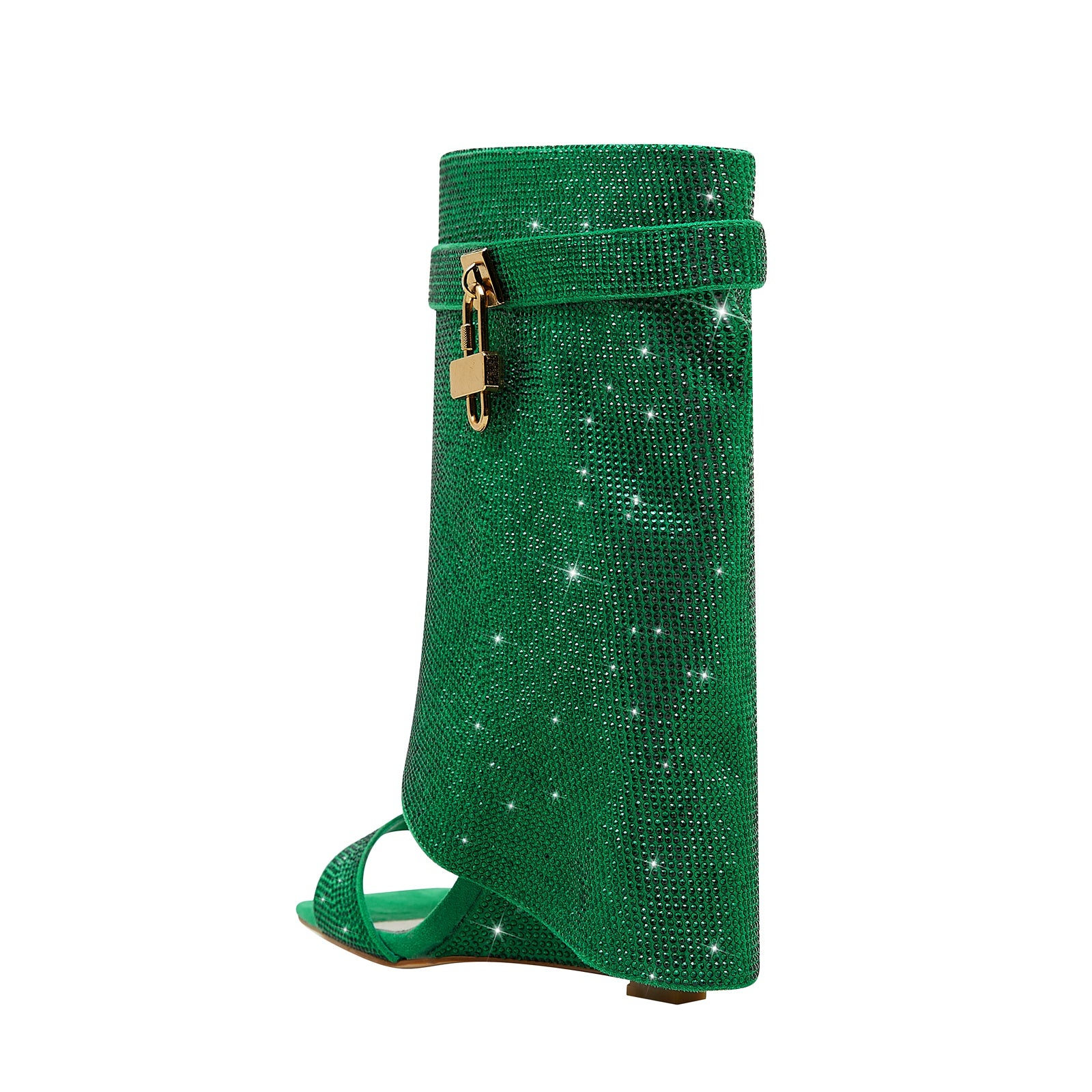 Step into avant-garde fantasy with the Glittery Rhinestone Square Toe Mid High Sandal Boots, where futuristic glam meets couture drama. Drenched in emerald sparkle and topped with a gold padlock accent, this head-turning hybrid redefines what statement footwear looks like - bold, sculptural, and utterly unforgettable.