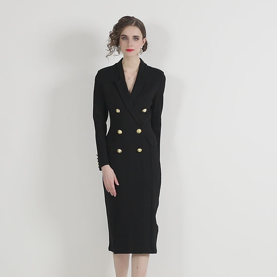 This Gold Double-Breasted Black Midi Blazer Dress is the epitome of empowered elegance, merging masculine structure with feminine sophistication for the modern woman who leads with style and confidence.