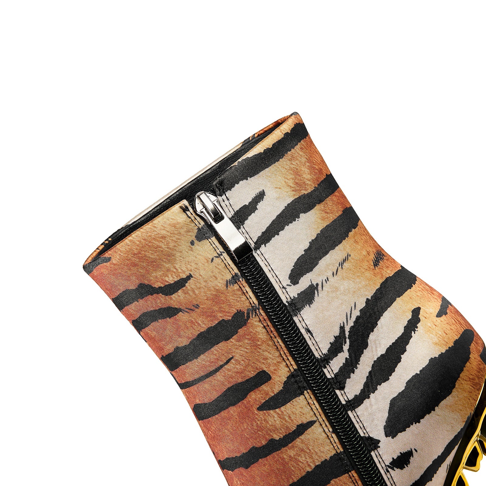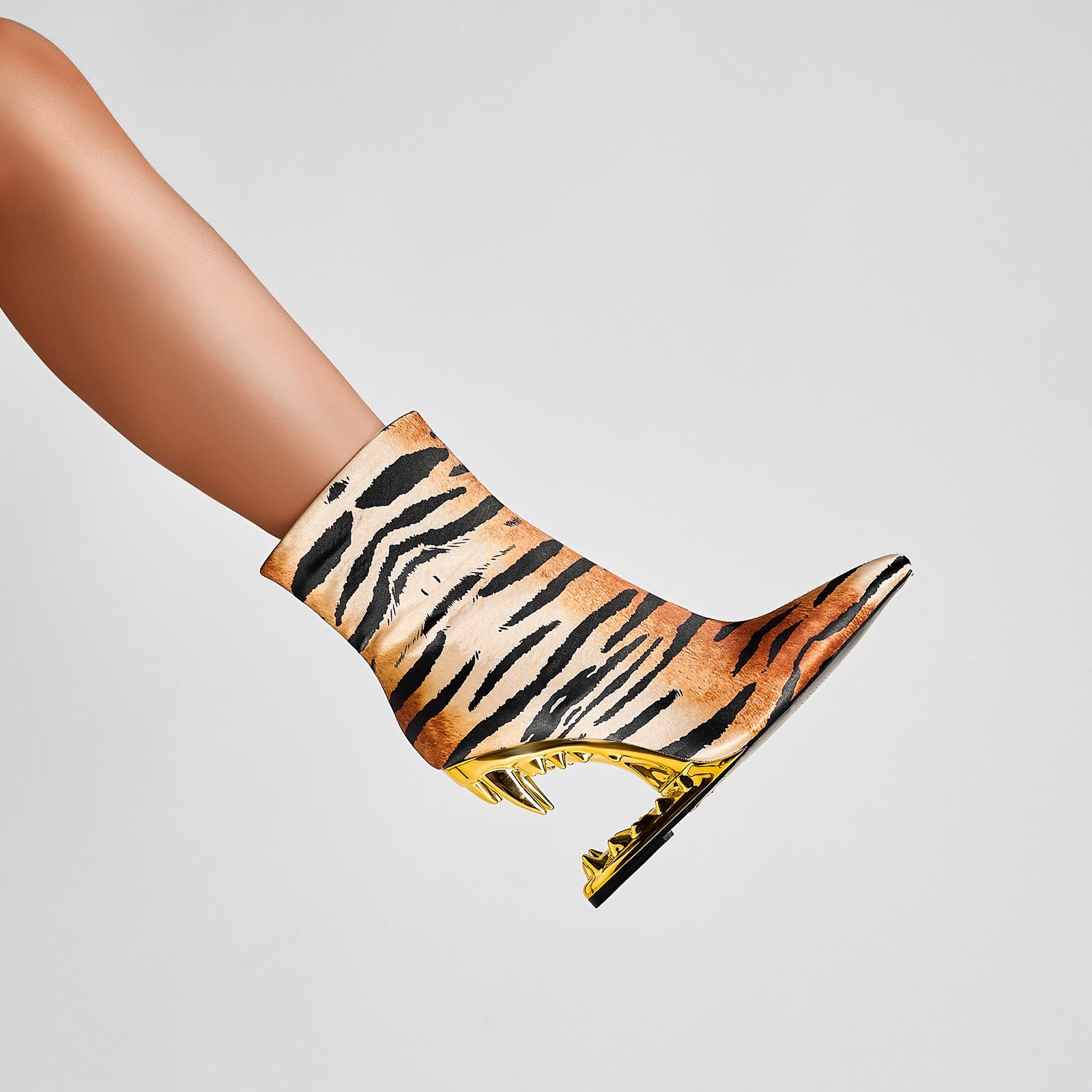Unleash your inner wildcat with the Golden Tiger Bite Heel Ankle Boots, a fierce fusion of animal instinct and fashion fantasy. Wrapped in bold tiger stripes and finished with a razor-sharp golden jaw heel, this statement stunner is made for those who pounce on the spotlight.