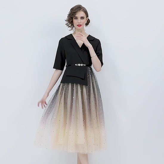 This Gradient Champagne Formal Evening Dress effortlessly evokes the magic of a twilight sky with its sophisticated, structured black top and the flowing ombré tulle skirt, which sparkles like stardust. Whether you're attending a gala, wedding, or upscale soirée, this formal evening dress for women will have you shining from every angle.