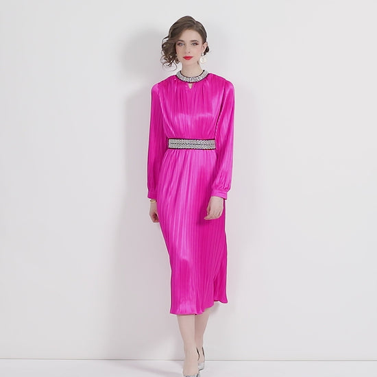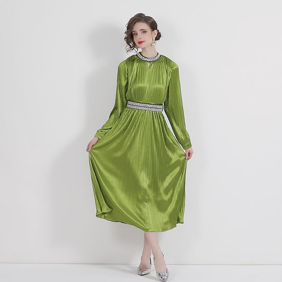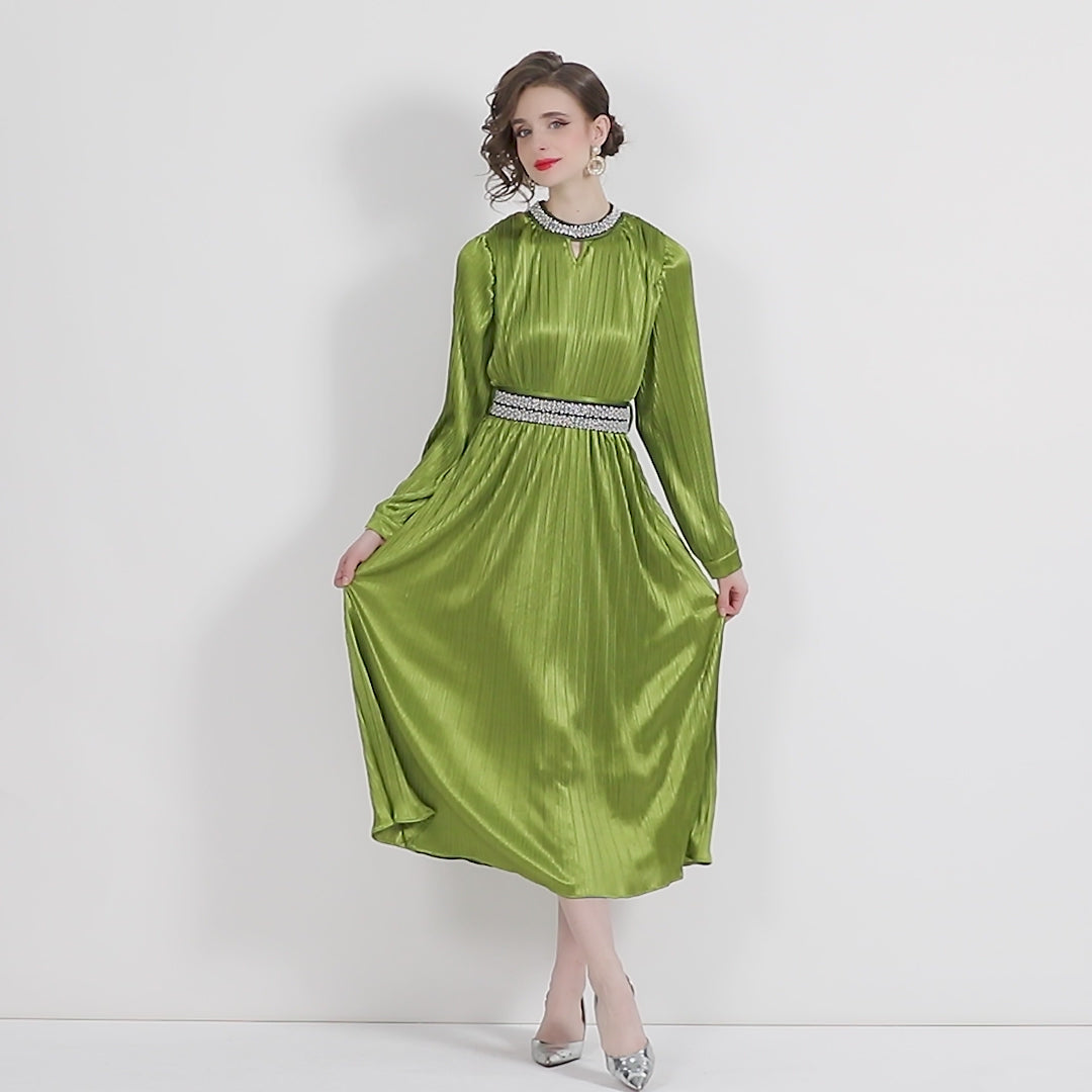 Lantern Sleeve Waist Tie Heavily Beaded Pleated Dress 872