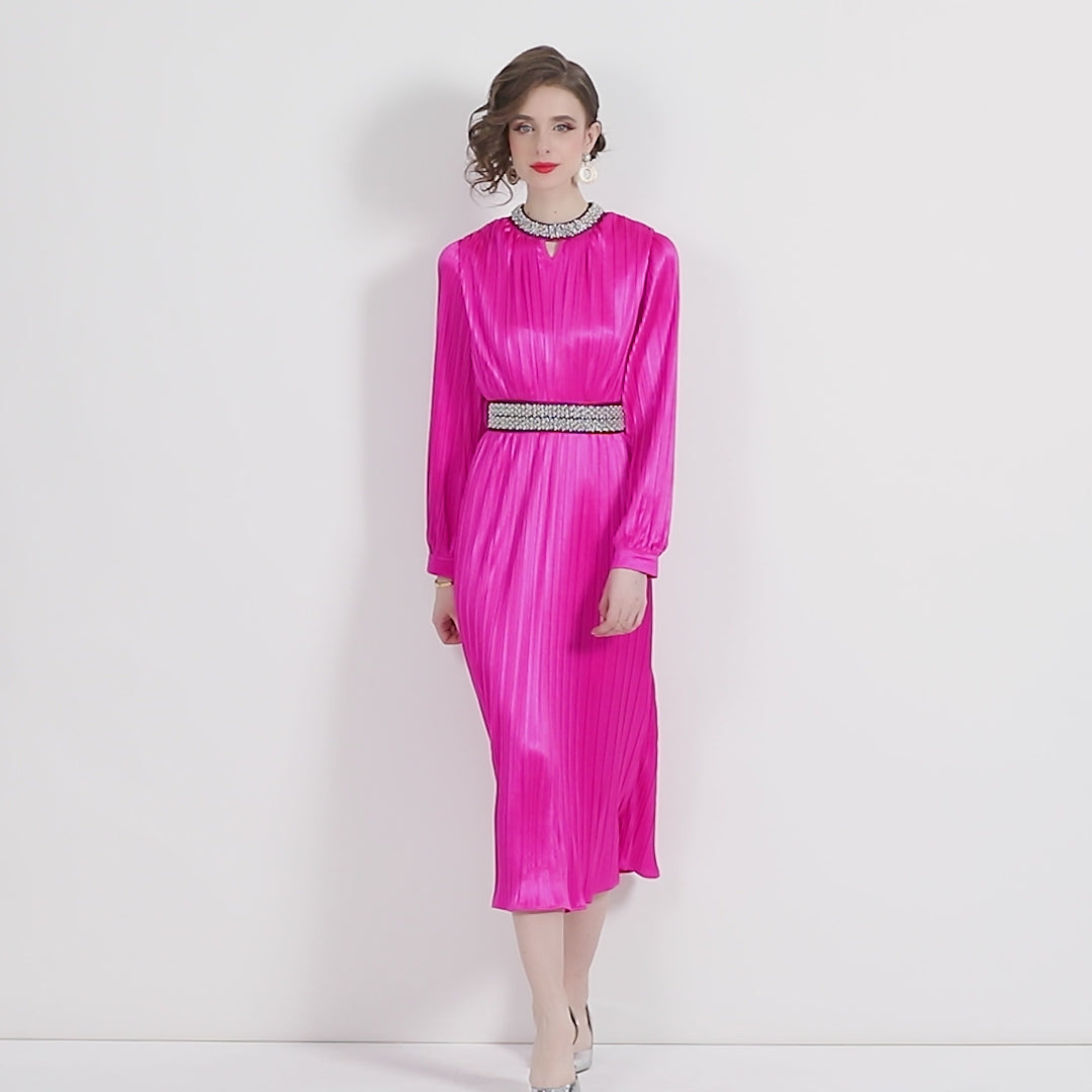 Lantern Sleeve Waist Tie Heavily Beaded Pleated Dress