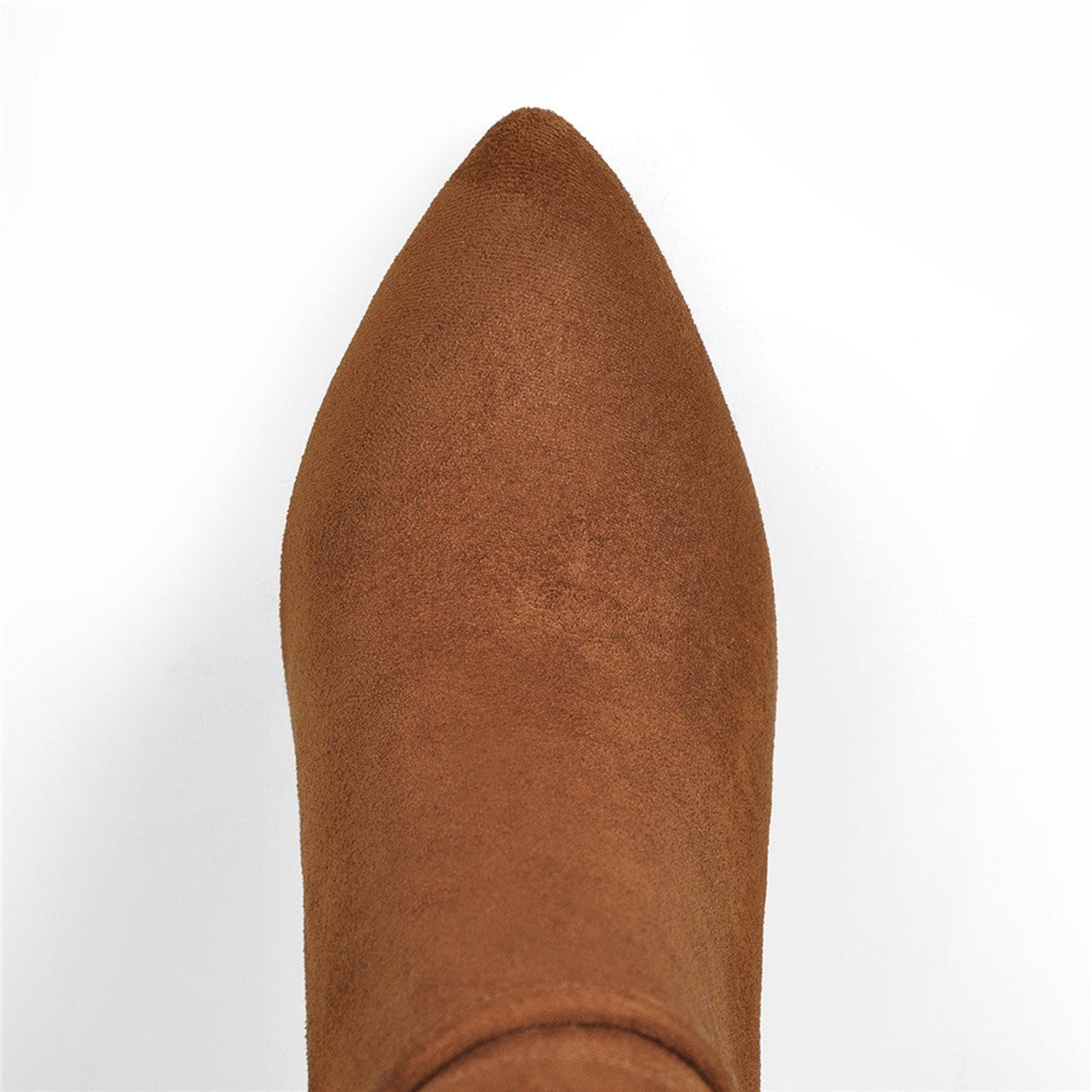 Quiet luxury takes center stage in the Lavish Brown Suede Pointed Toe Knee High Boots, a sophisticated staple that speaks volumes in softness and stature. Crafted in plush suede and elevated with a golden stiletto heel, this pair blends timeless elegance with sharp feminine power.