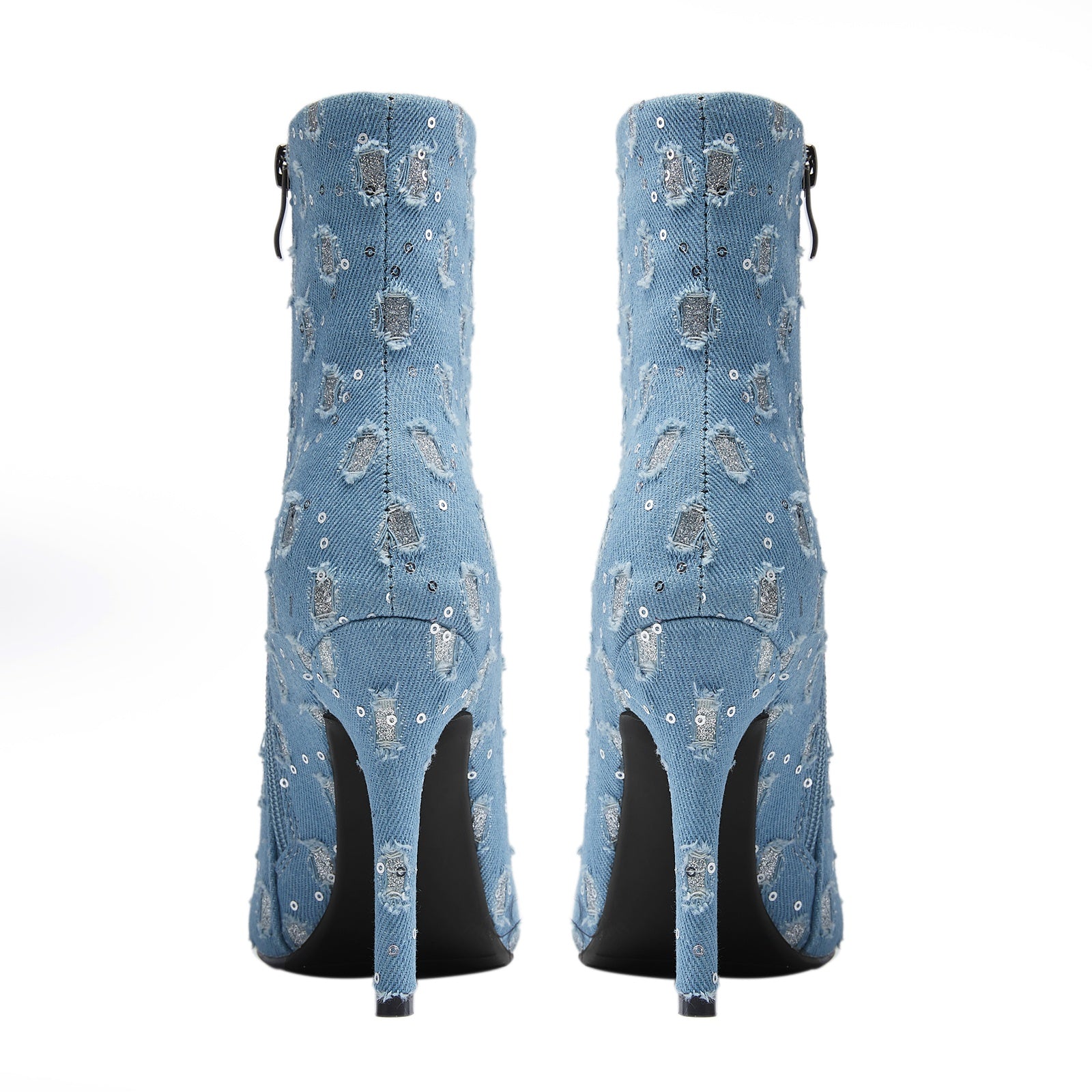 Whimsy meets runway polish in the Light Blue Denim Distressed Dots Pointed Ankle Boots, a playful yet poised addition to the modern fashion rebel’s closet. Crafted in a soft-wash denim and speckled with glimmering distressed dots, this stiletto-heeled boot brings just the right amount of sparkle and texture to your day-to-night rotation.