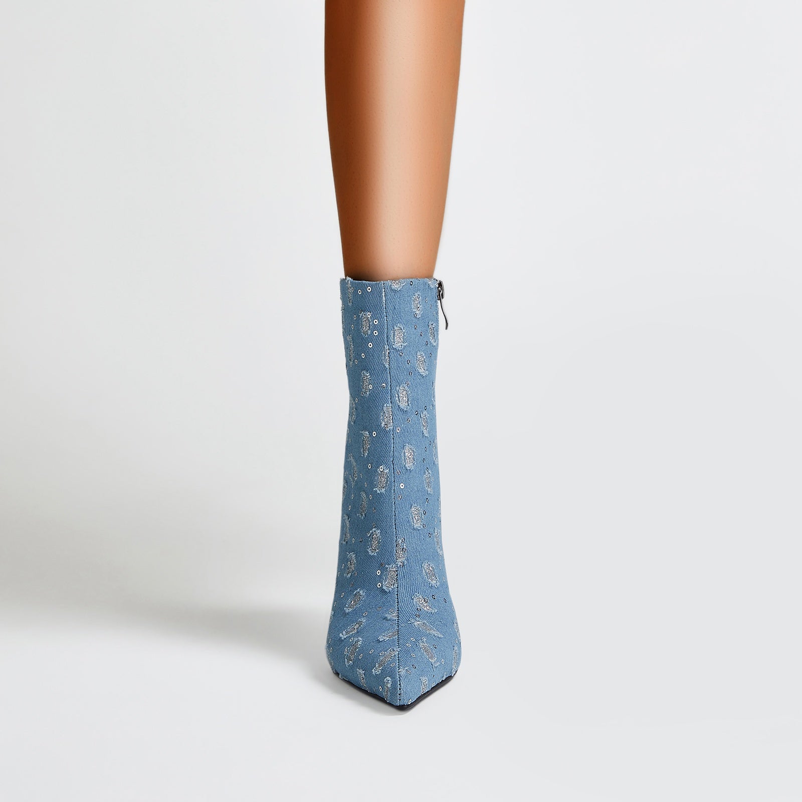 Style these distressed ankle boots for women with a crisp oversized shirt and mini denim skirt for a coordinated coquette look, or pair them with neutral tailoring to let the boots do all the talking. Get these Light Blue Denim Distressed Dots Pointed Ankle Boots from Jady Rose by 0cm.