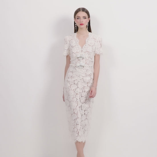 Style this pencil dress for women with pearl drop earrings and silver heels for a look that’s both graceful and captivating. It's definitely designed to make lasting impressions in the most elegant way possible. Get the Magnolia White Double Layer Lace Cut Out Pencil Dress from DZA by 0cm.