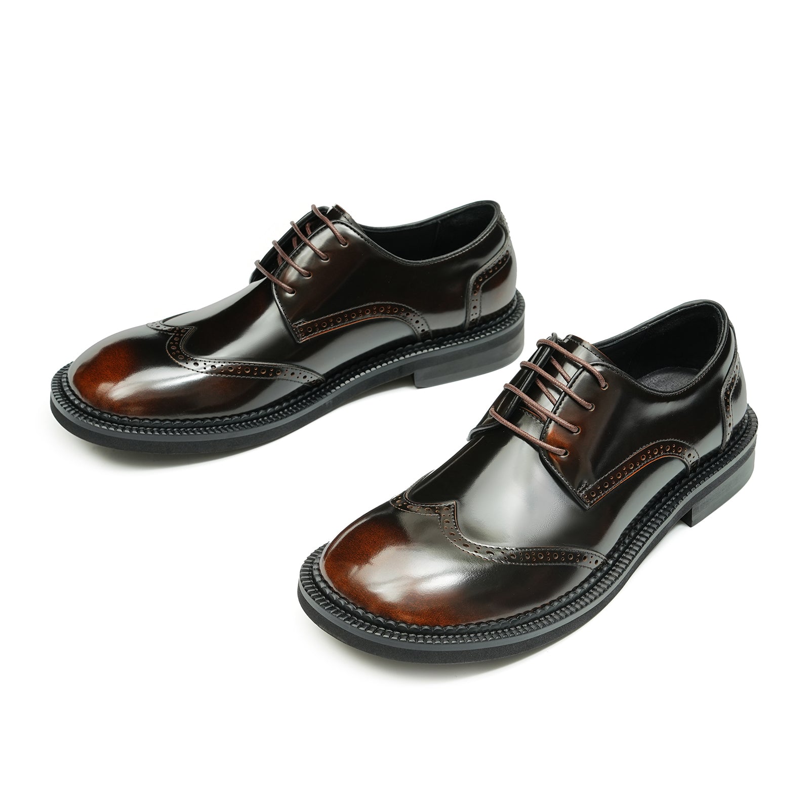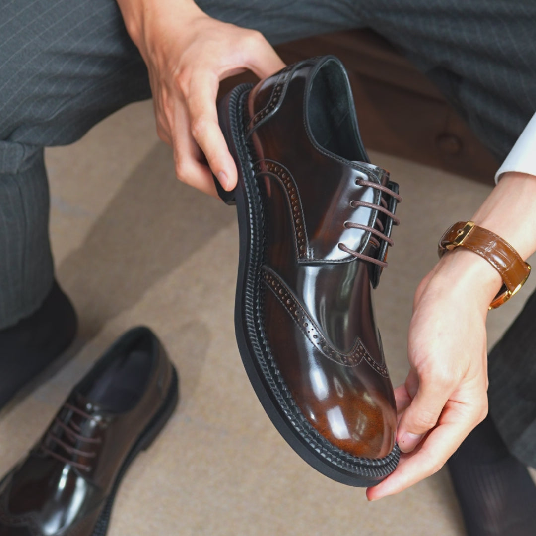 Pair these glossy, lace-up shoes for men with a tailored suit for professional authority, or wear them with chinos and a button-up shirt for a smart-casual setting. On relaxed days, they work seamlessly with denim and a lightweight sweater, keeping you sharp without effort. Designed for walking and all-day comfort, they ensure every stride feels confident and refined. Discover the Men’s Glossy Calfskin Classic Brogue Lace Up Derby Shoes for Men from Neweyesee by 0cm.