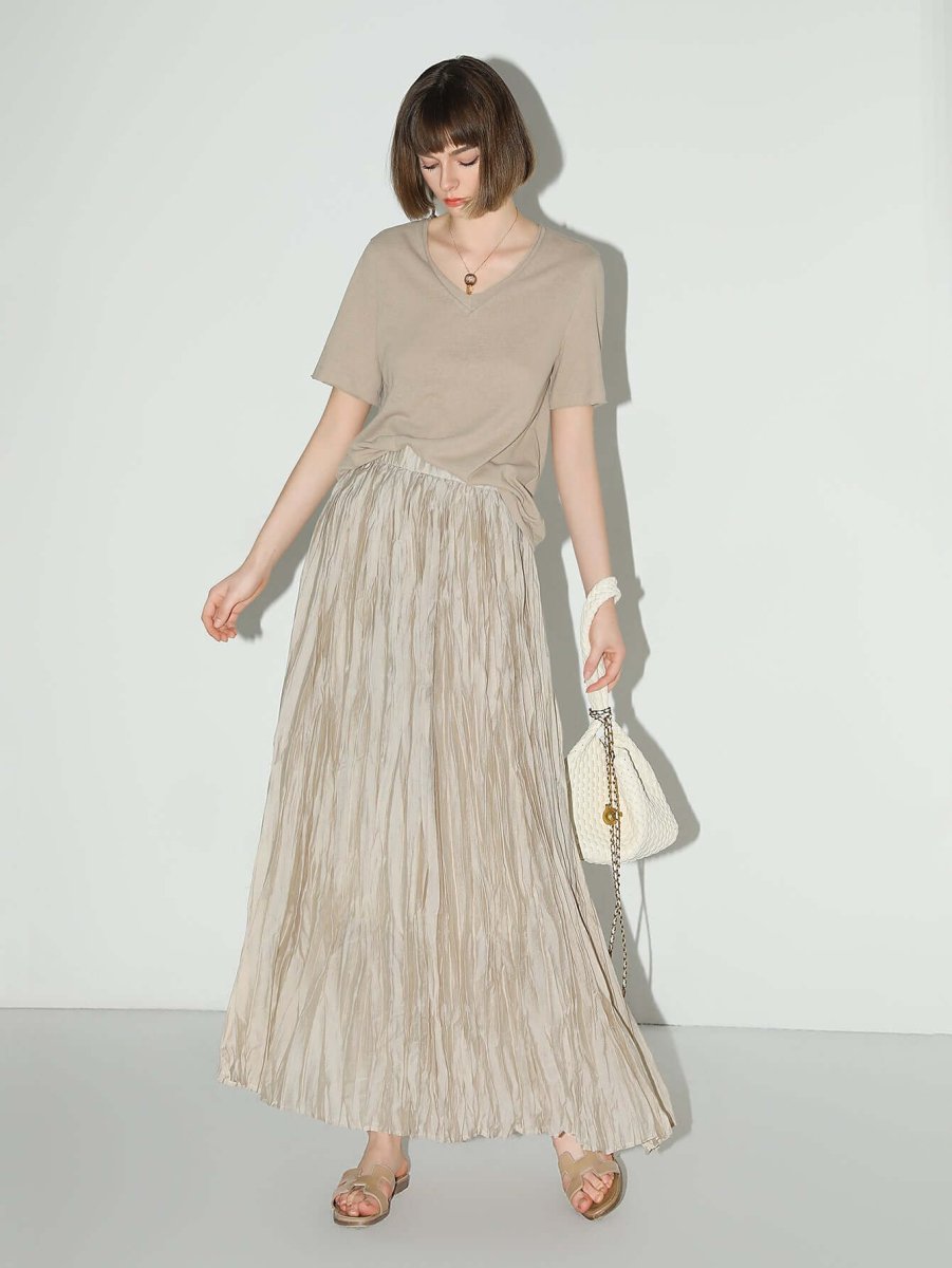 Embrace the art of simplicity with the Mocha V-Neck Cotton Short-Sleeve Tee, inspired by Wabi-Sabi aesthetics. With its relaxed fit, straight-cut silhouette, rolled-edge V-neck, and frayed cuffs, this tee seamlessly blends laid-back charm with understated elegance.
