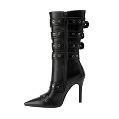 Dominatrix Leather Buckle Strappy Knee High Boots