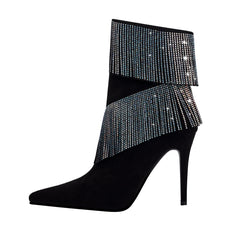 Waterfall Fringe Black Pointed Toe Stiletto Boots