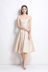 - A soft champagne base with gold foil detailing brings just the right amount of statement sparkle