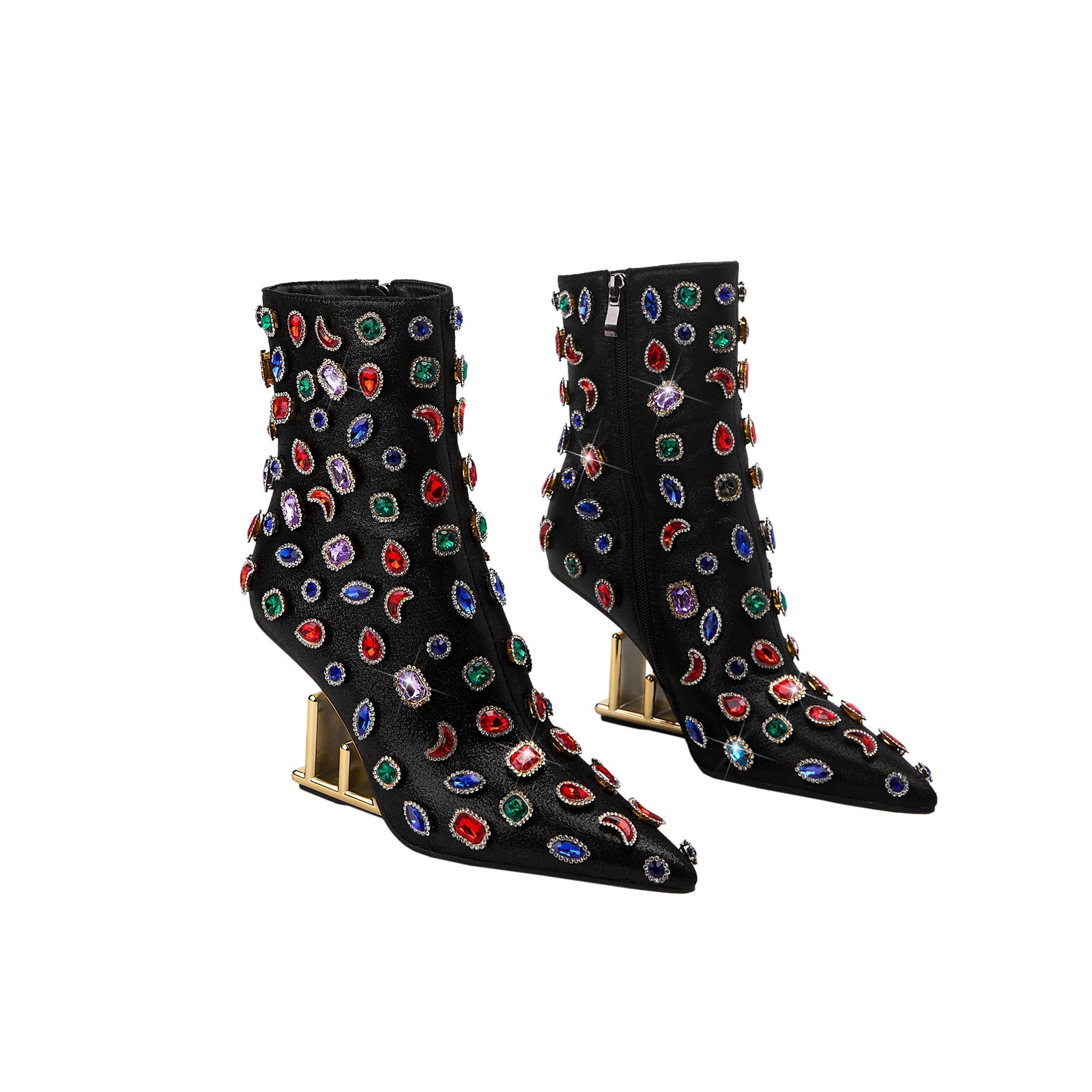 We are loving the fantastical dreamscape of these Gem Encrusted Stonehenge Heel Ankle Boots, a dazzling fusion of mod energy and futuristic funk. Dripping in rainbow-hued rhinestones and set on sculptural golden heels, they radiate disco diva attitude with every strut.