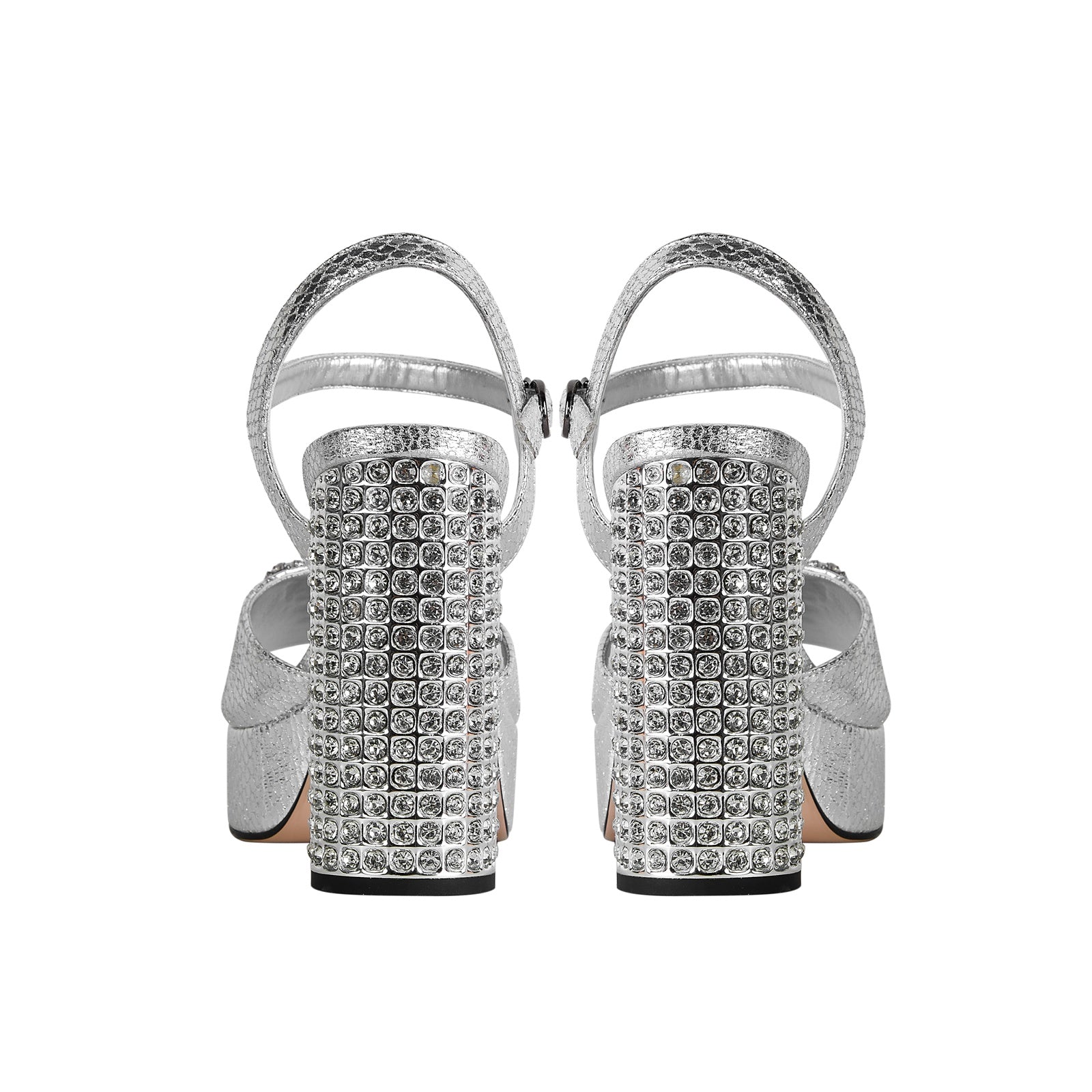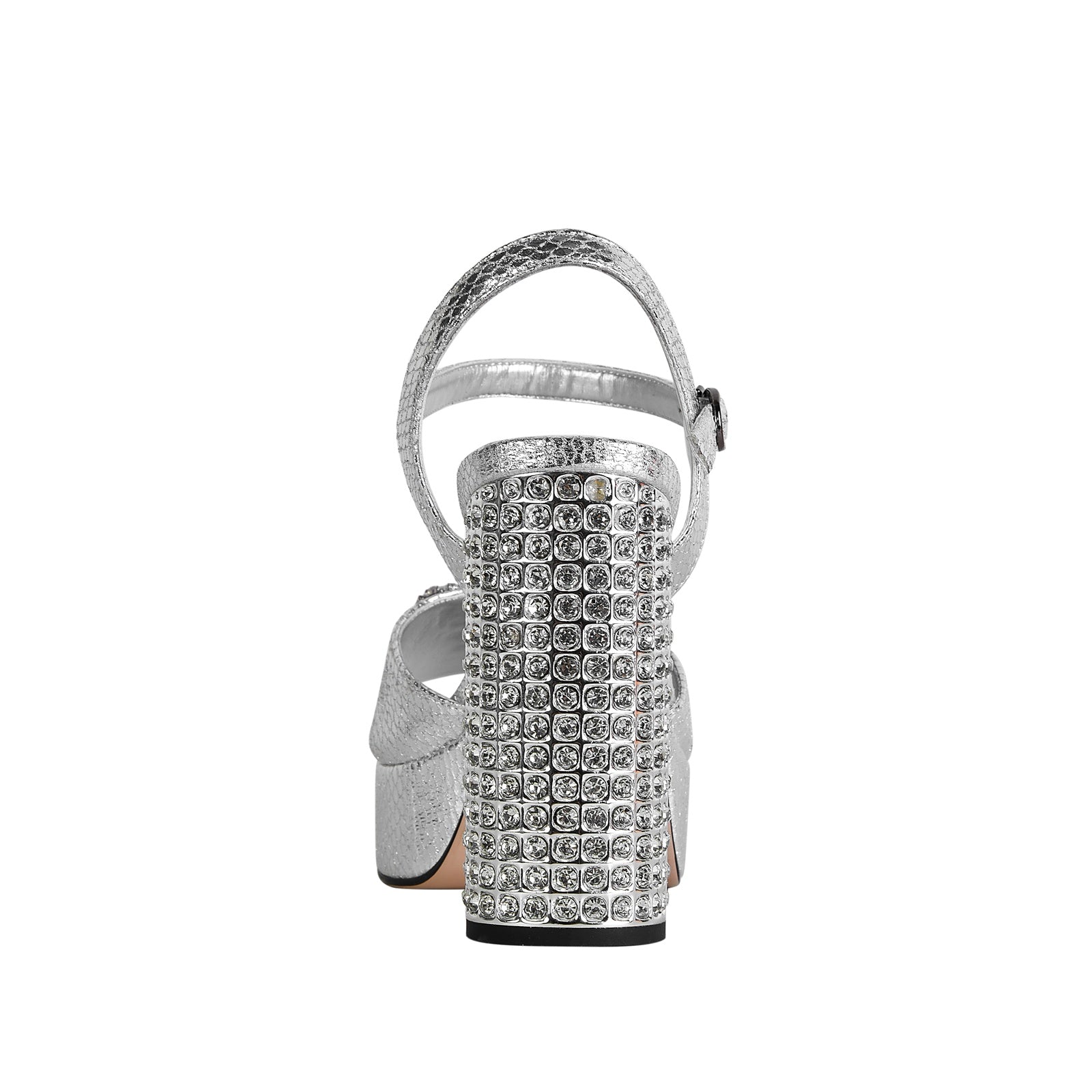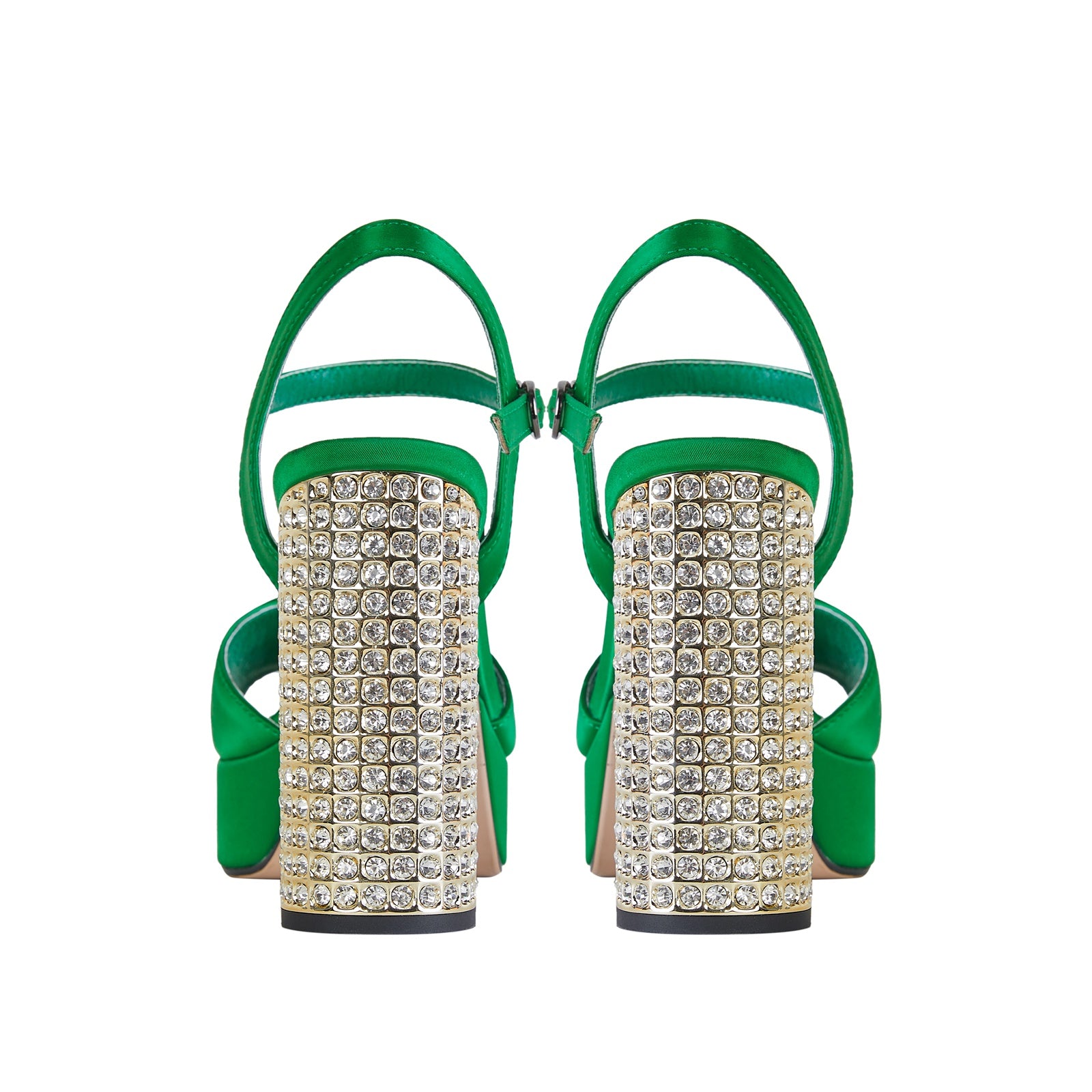 - The chunky gold heel is covered in glitzy crystals that shimmer with every step