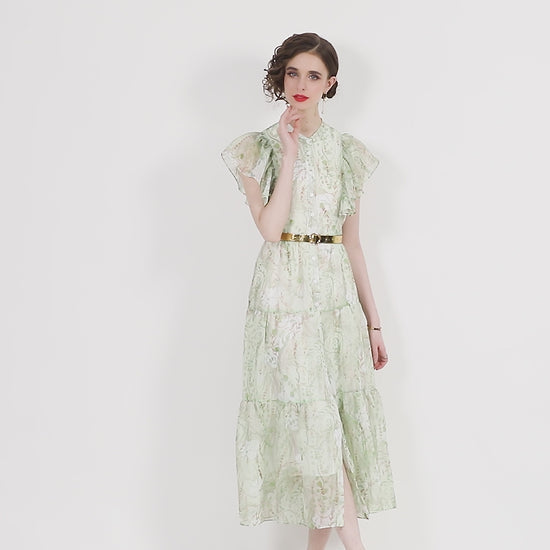 - Fluttery short sleeves with cascading ruffles give the dress movement and a touch of femininity