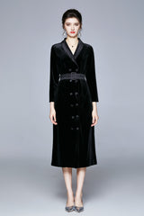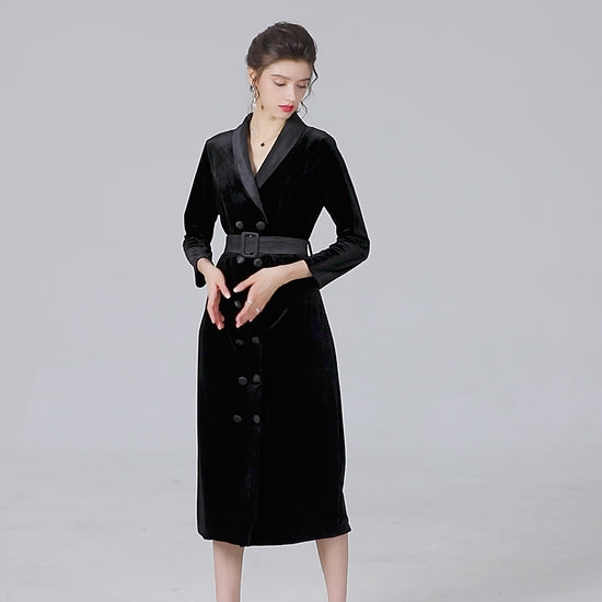 Alluring with a whisper of Parisian mystique, this Seductive French Velvet Coat Dress is the embodiment of modern-day femme fatale elegance. Draped in black velvet, it embodies the confidence of classic French tailoring, combining the softness of midnight glamour with the allure of wild evenings.