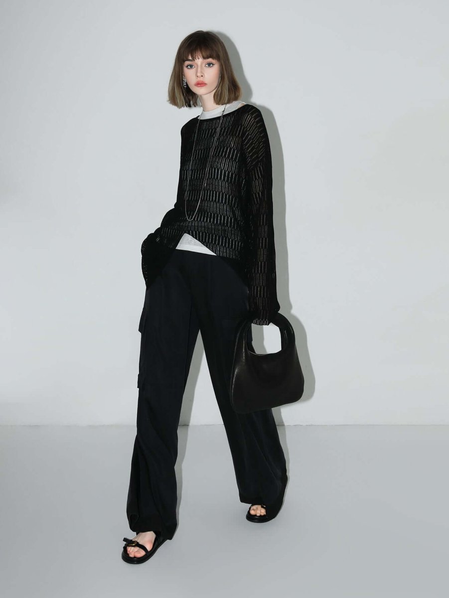 Layer over a fitted camisole, tuck into tailored trousers, and finish with ankle boots for a polished office outfit. Or style the Sheer Knit Top with Asymmetrical Hem with a flowy maxi skirt, strappy sandals, and a sunhat for an airy, coastal vibe.