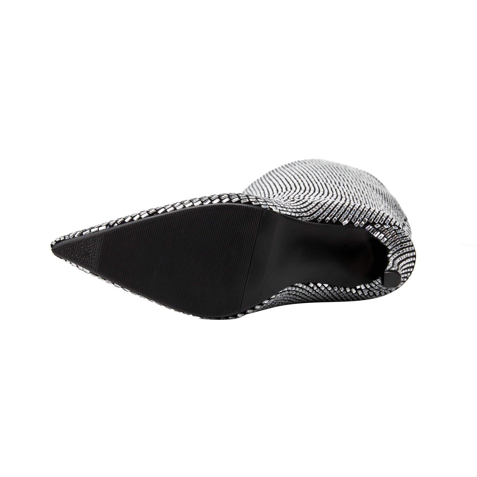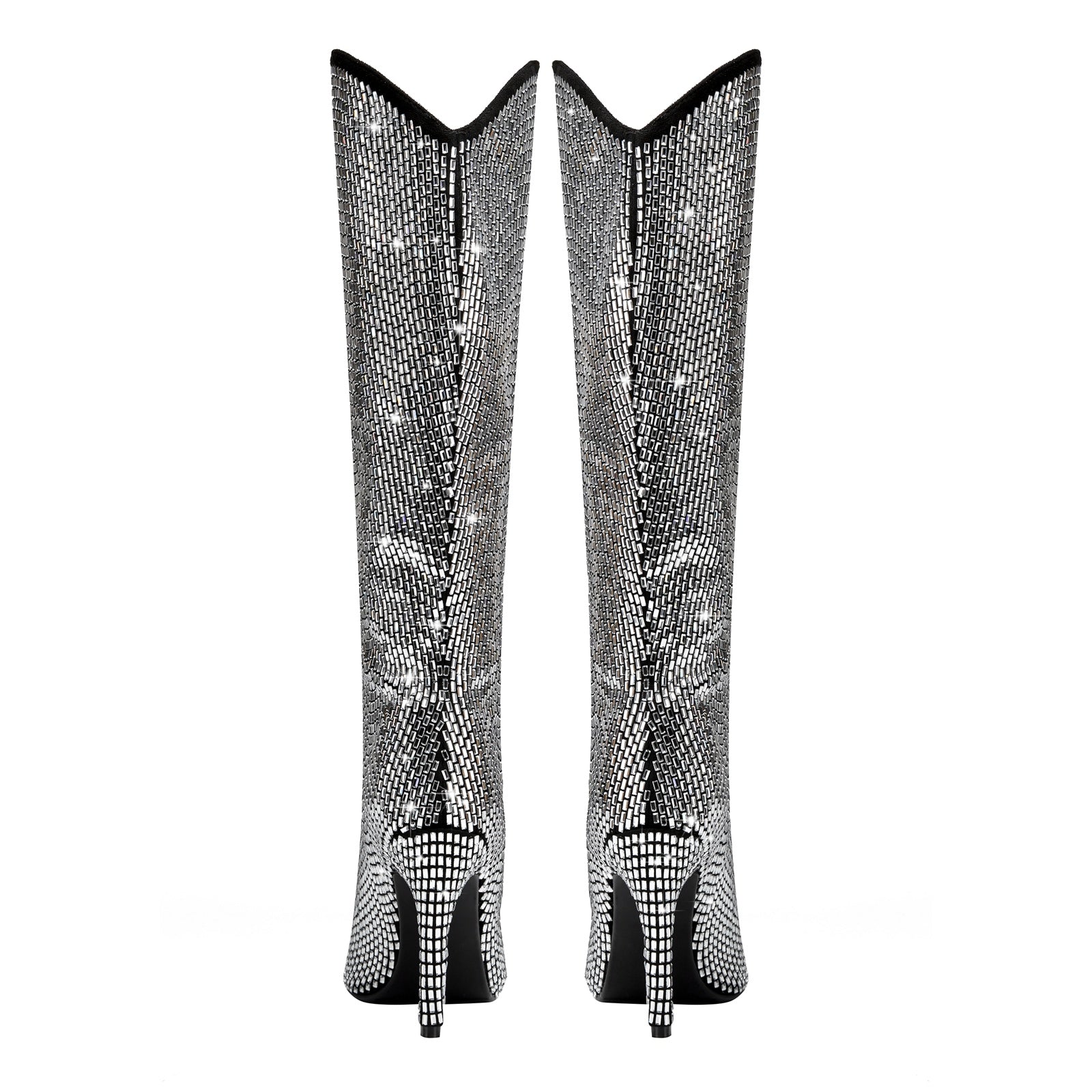 Shine like a star in the Silver Encrusted Metallic Knee High Boots, a dazzling fusion of futuristic glam and sculptural elegance. Covered in reflective crystal mesh and shaped with a modern western-inspired cut, these boots turn every sidewalk into your own personal catwalk.
