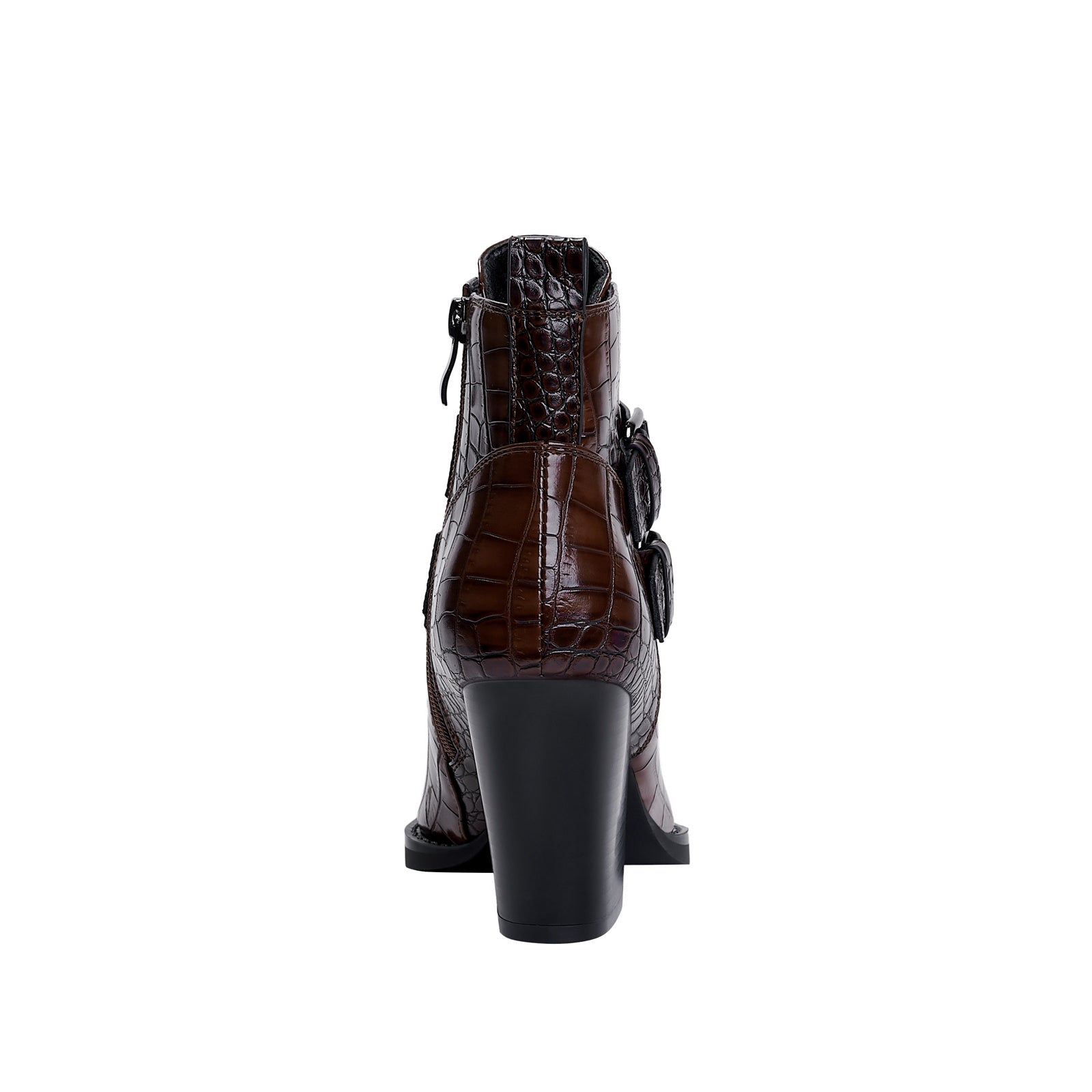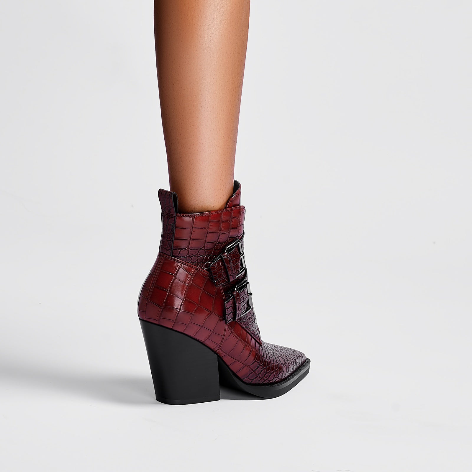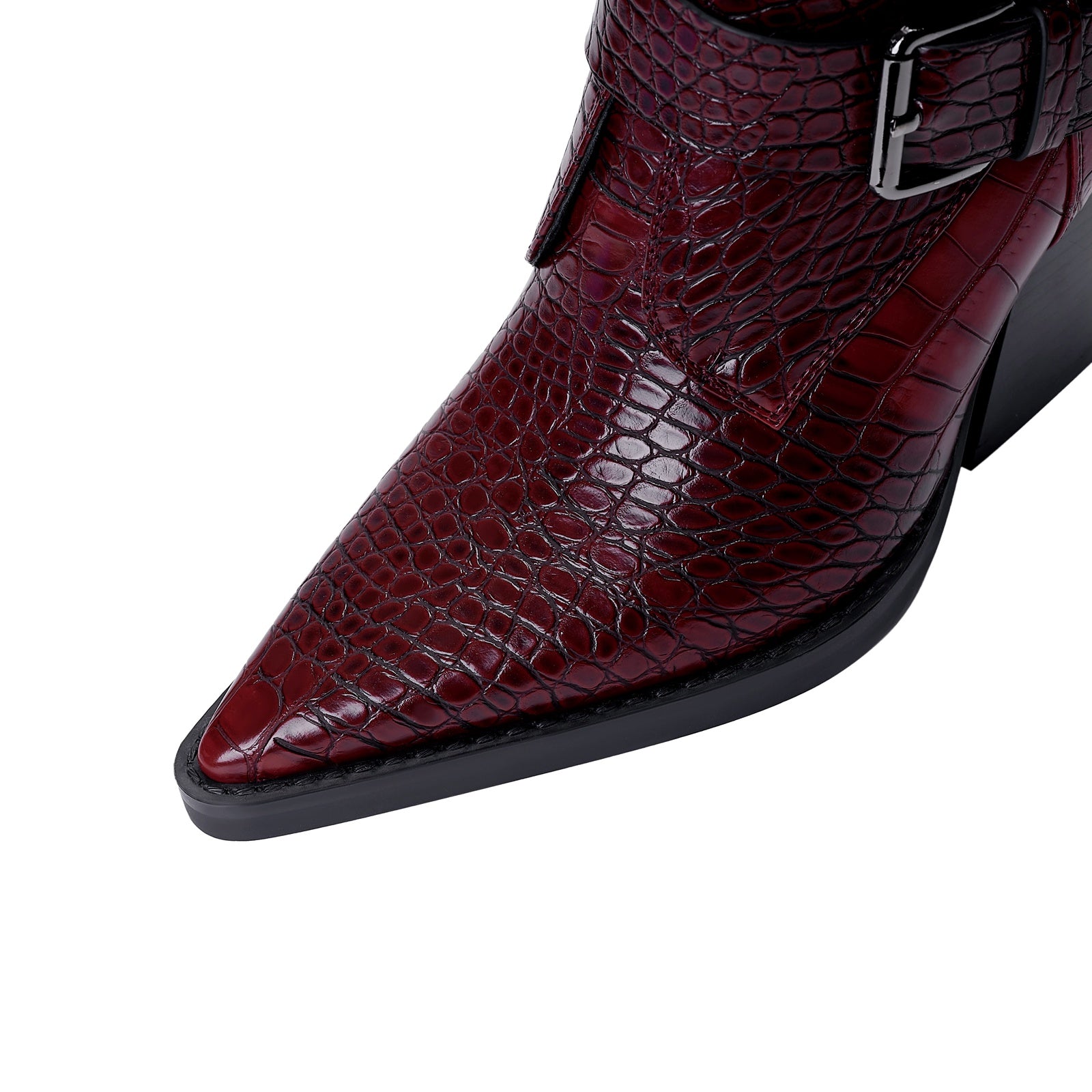 Edgy sophistication takes form in the Sleek Crocodile Embossed Pointed Toe Boots, a sharp, city-ready silhouette with a hint of Western grit. Crafted in glossy croc-embossed leather and finished with double buckle detailing, this boot is equal parts polished and rebellious, made for the modern woman who walks with purpose and style.