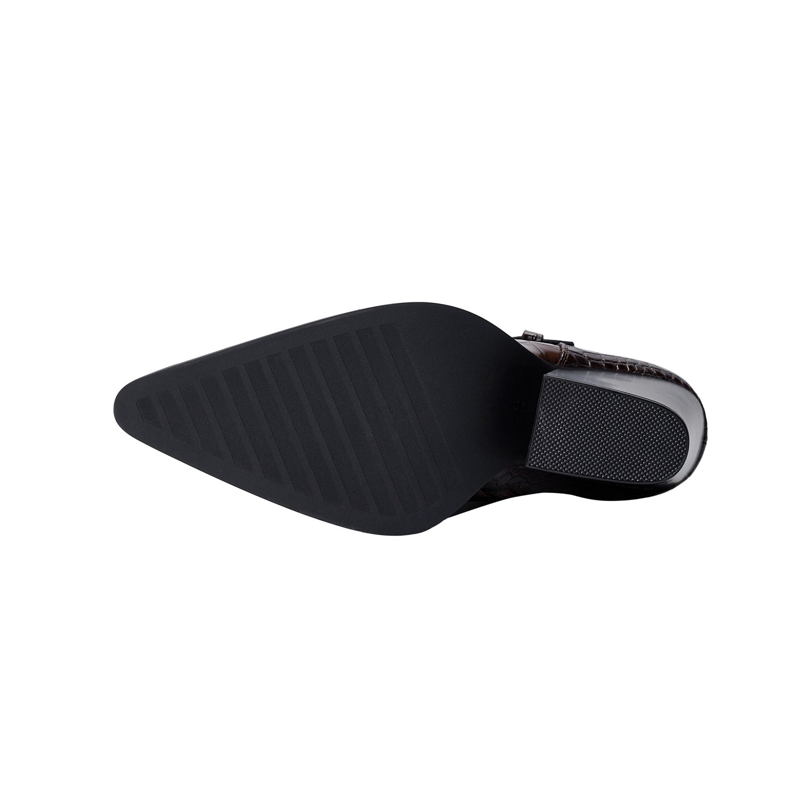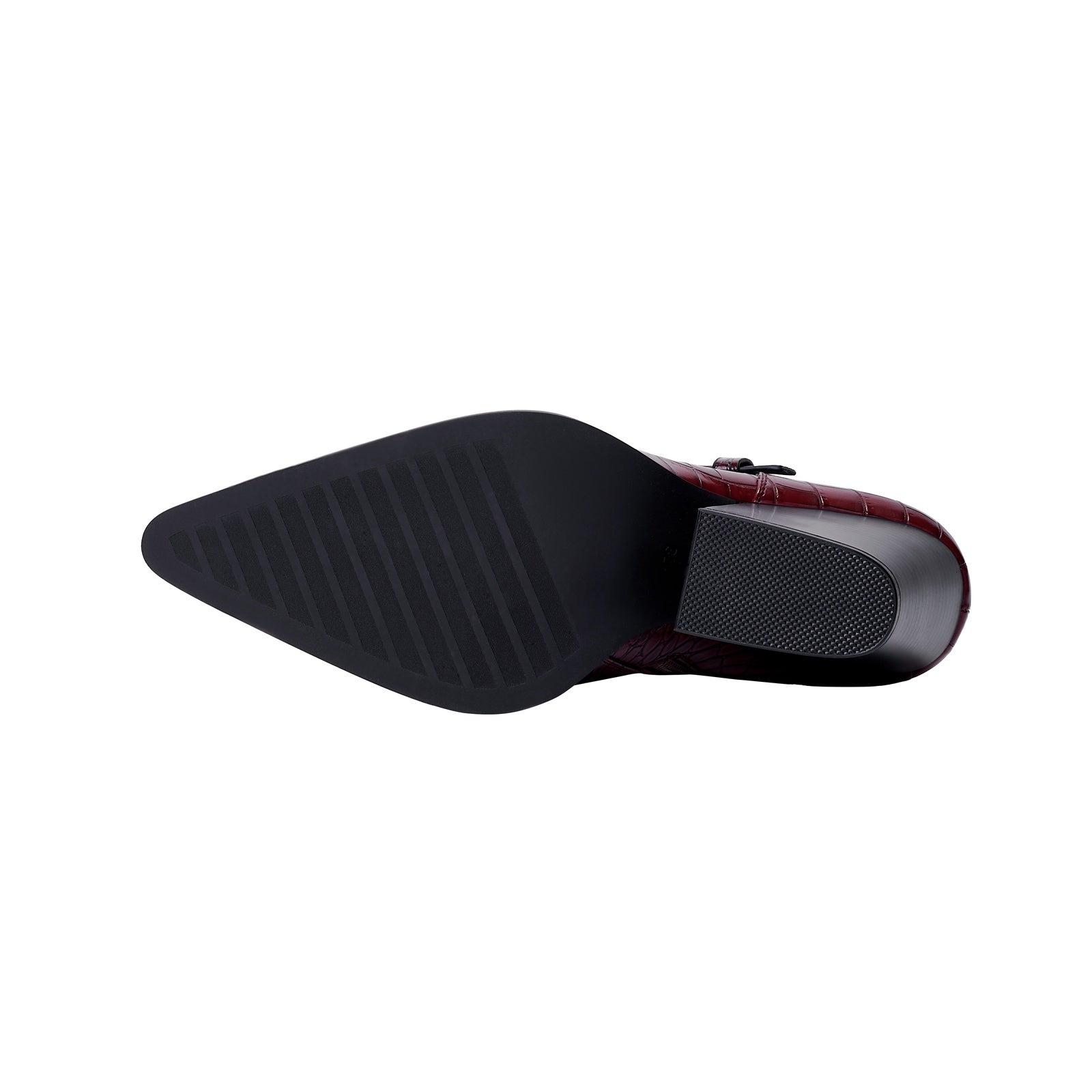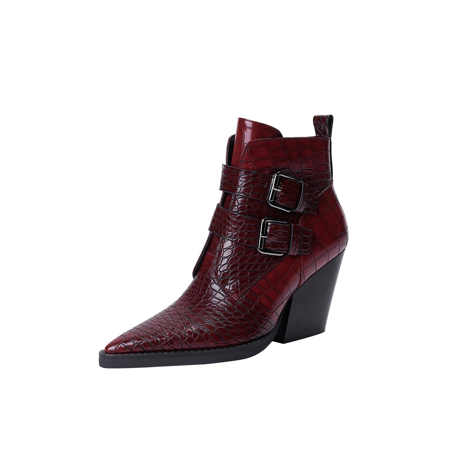 Edgy sophistication takes form in the Sleek Crocodile Embossed Pointed Toe Boots, a sharp, city-ready silhouette with a hint of Western grit. Crafted in glossy croc-embossed leather and finished with double buckle detailing, this boot is equal parts polished and rebellious, made for the modern woman who walks with purpose and style.