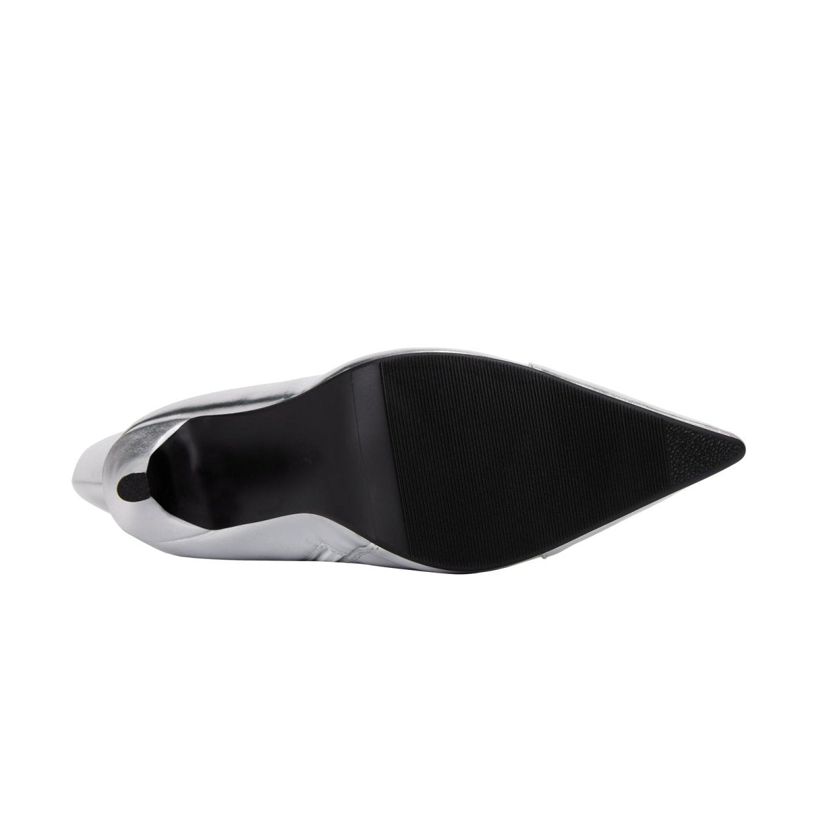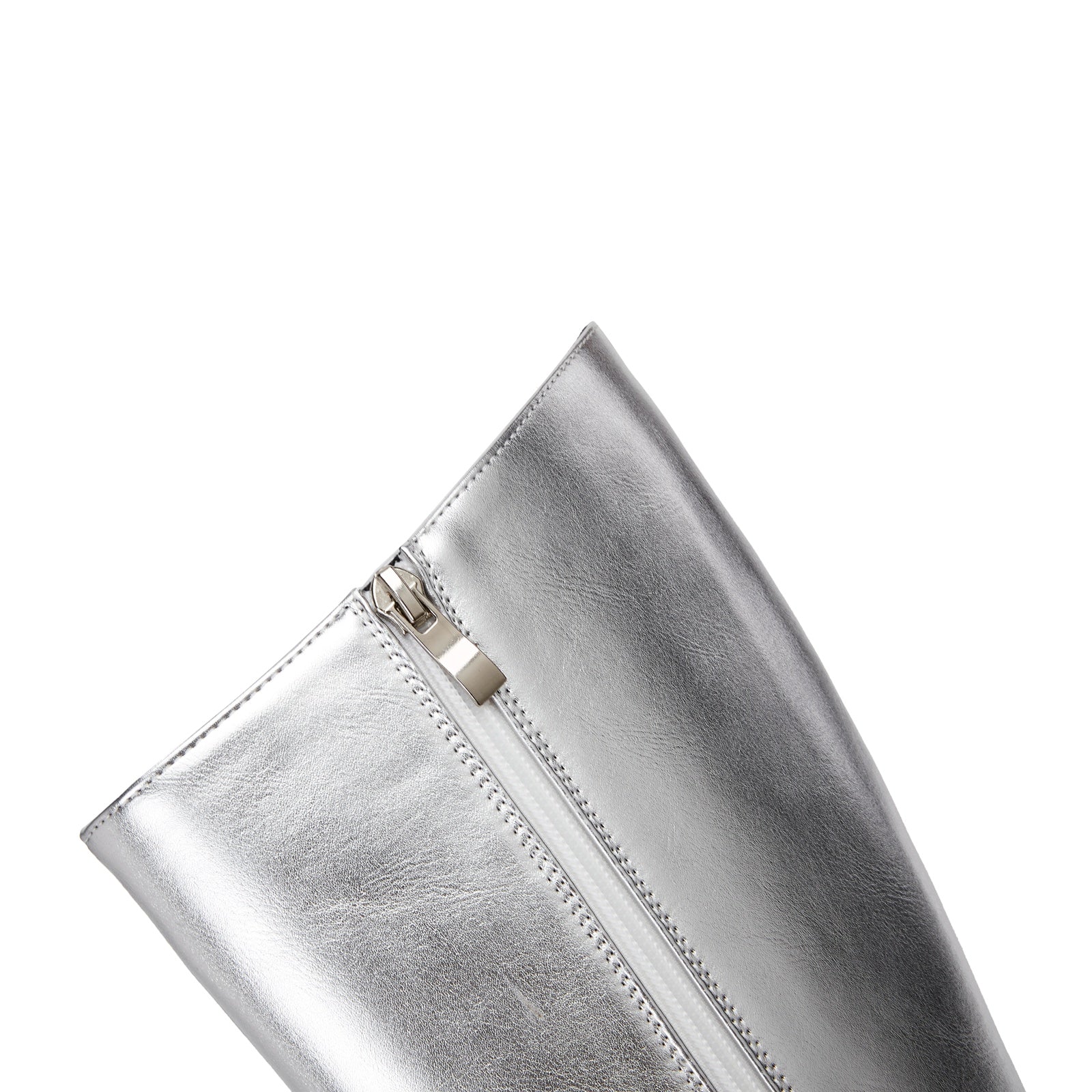 Style these stunning knee high boots for women with a silver lamé mini dress and geometric sunglasses for a head-to-toe cosmic look. Mix them with an asymmetric skirt, iridescent top, and robotic accessories. Get the Sleek Silver Metallic Pointed Knee High Boots from Jady Rose by 0cm.