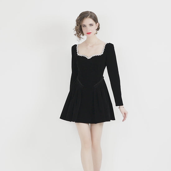Pair this black velvet dress for women with red lips, vintage waves, and a crystal clutch for a romantic dinner or gala. Add strappy black heels and sleek hair for an edgy contrast to the vintage silhouette, or style with sheer tights and a cropped faux-fur jacket for that elegant winter look. Get the Square Neck Mid Waist Black Vintage Beaded Velvet Dress from DZA by 0cm.
