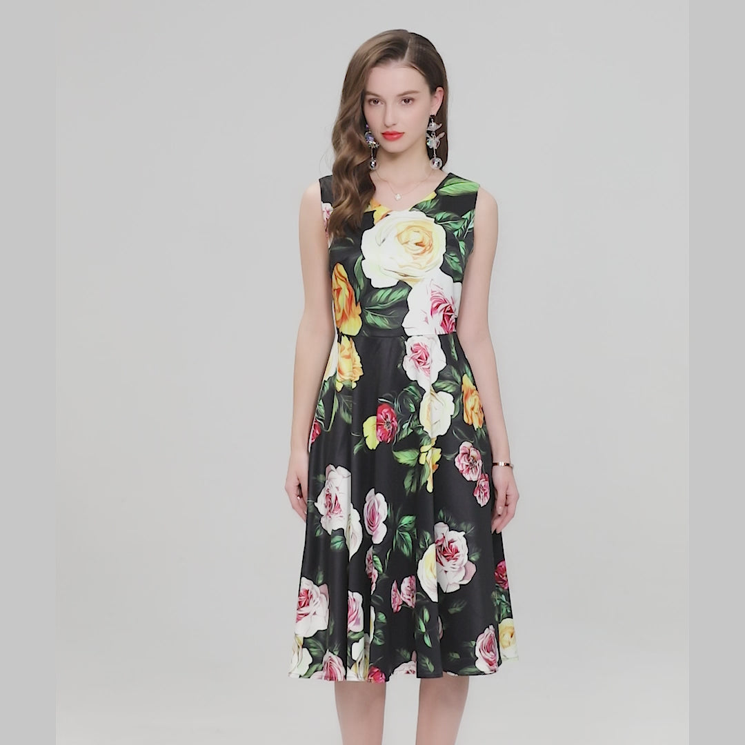 Step into a blooming dream where elegance meets the romance of a secret garden. The Structured A-Line Floral Black Dress captures the lush beauty of a summer rose garden in full bloom, set against the mystery of a midnight sky. It's a celebration of nature's charm wrapped in a silhouette made to flatter and enchant.