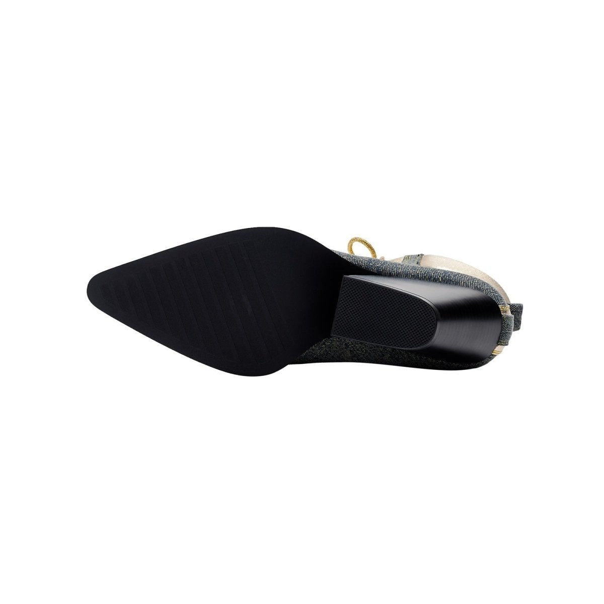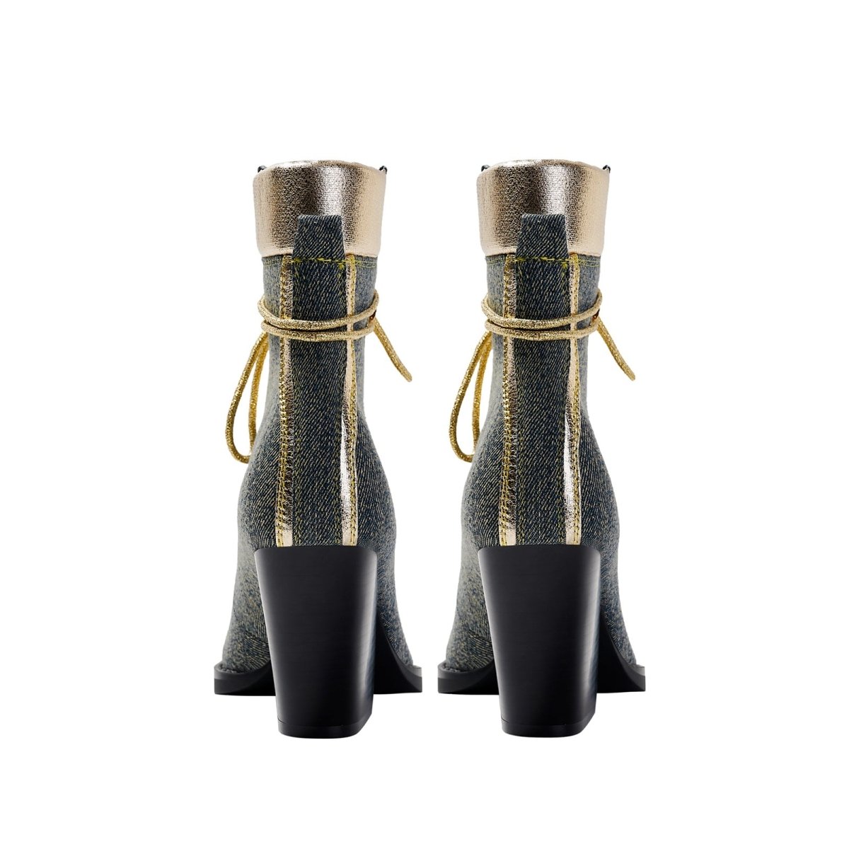 - The mix of smooth metallic fabric and washed denim gives the boot a striking contrast and modern texture