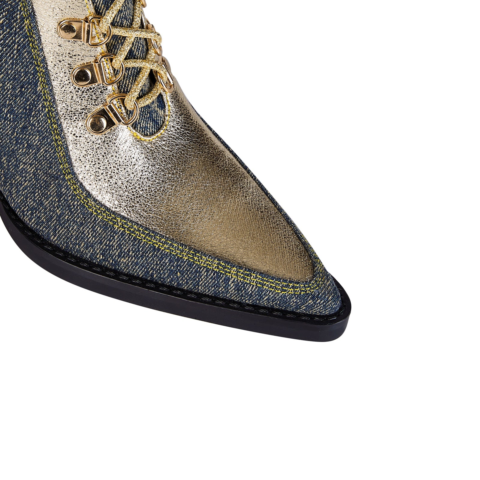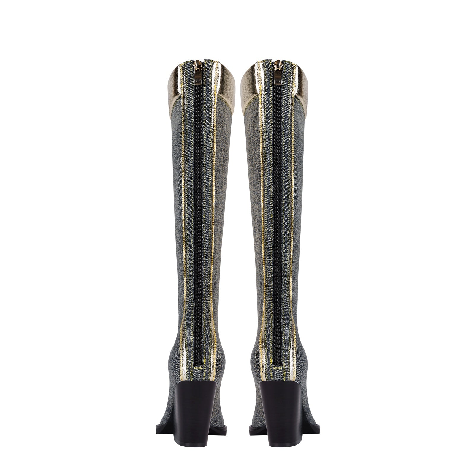 Western glam rides high in the Texas Denim Lace Up Knee High Boots, a statement-making blend of rodeo charm and city sparkle. With its denim body, golden metallic accents, and bold lace-up front, this boot reinvents the cowboy classic with high-fashion flair and fierce femininity.