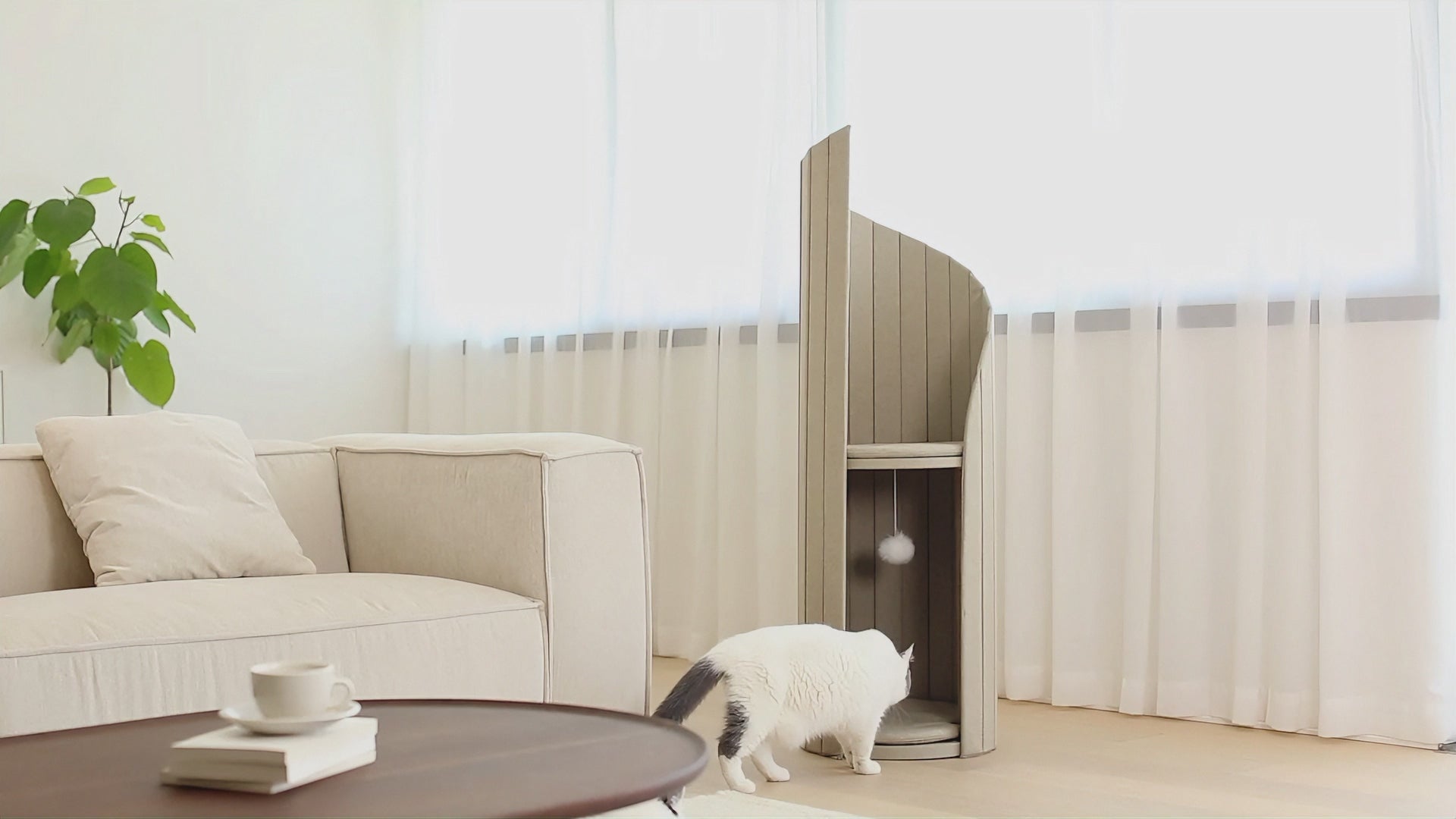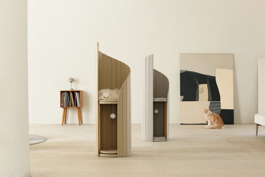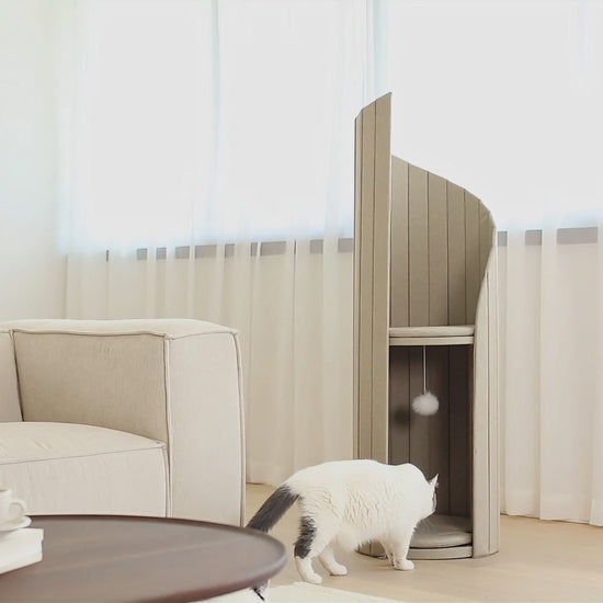Bring calm Scandinavian-inspired design into your home with the Time Tower Modern Cat Tree Condo. Designed as a sculptural vertical structure, this elegant cat tower blends seamlessly with modern interiors while providing a cozy, functional playground for your cat. The flowing curved panels create a semi-enclosed space that offers privacy, comfort, and security. Cats can climb, hide, rest, and play within the tower’s layered structure, satisfying their natural instincts without taking up much floor space. With a compact 40cm diameter, the vertical design maximizes usable height while minimizing footprint - perfect for apartments and modern homes. Built with a stable weighted base and multi-point support, the tower stays secure during climbing and play. The integrated scratching surface allows cats to stretch and sharpen claws, helping protect your furniture. Soft, breathable fabric covering ensures durability and comfort for year-round use. The removable cushion makes cleaning easy, while the included plush hanging ball adds playful interaction. A foldable panel design allows convenient storage and transport when needed. Available Colors