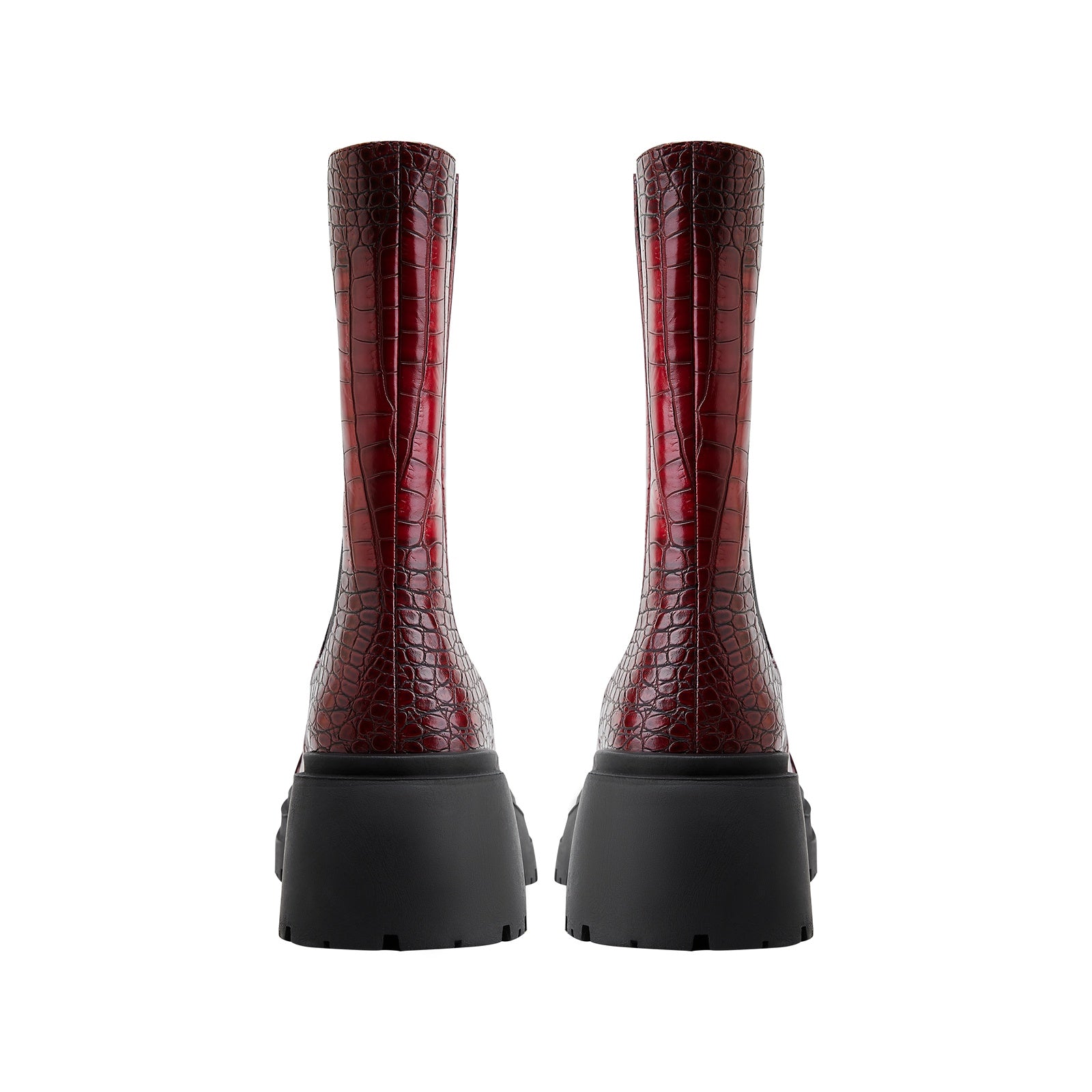 Flaunt edgy urban utility with the Two Tone Crocodile Embossed Walking Boots, a bold reimagining of everyday function with elevated attitude. With its deep red croc-embossed finish, sleek elastic gussets, and chunky treaded sole, this boot commands attention while delivering comfort for the streets.