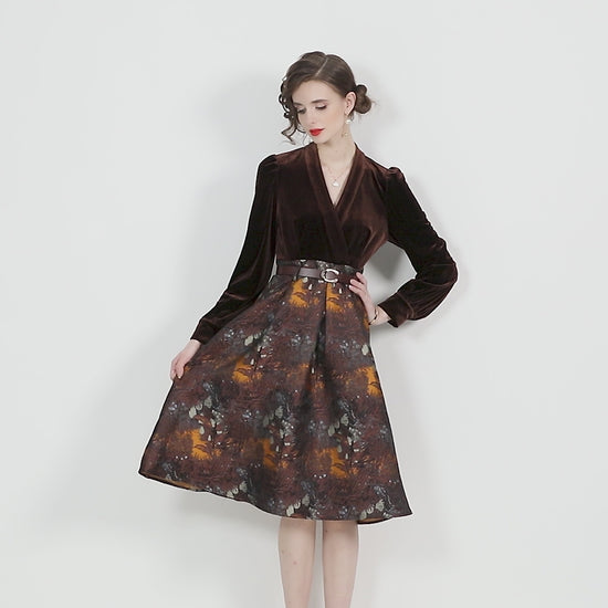 Fall in love with texture, tone, and timeless tailoring. This V-Neck Velvet Patchwork Coffee Jacquard A-Line Dress, where rich velvet meets baroque-inspired jacquard in a silhouette made to flatter. From gallery openings to festive evenings, this piece is your new-season signature.